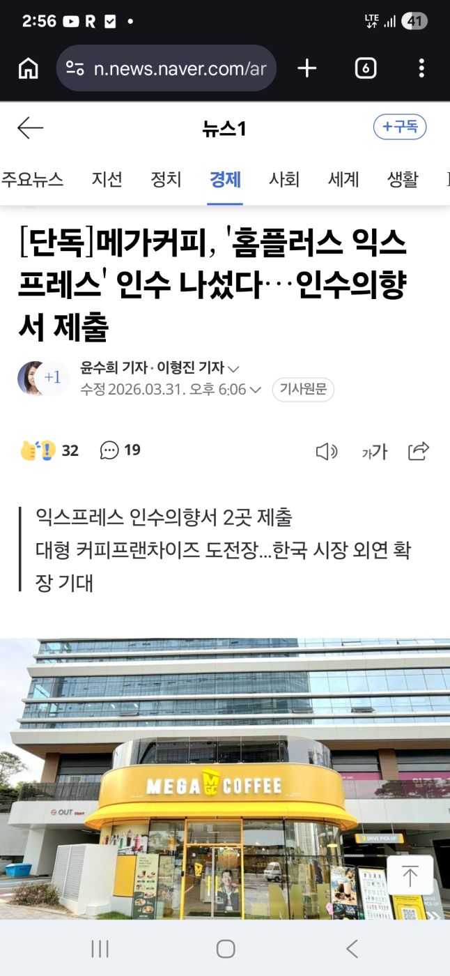 5037 경제단독]메가커피, '홈플러스 익스프레스' 인수 나섰다…인수의향서 제출 1 + 활활태워라 26/04/05 296 1