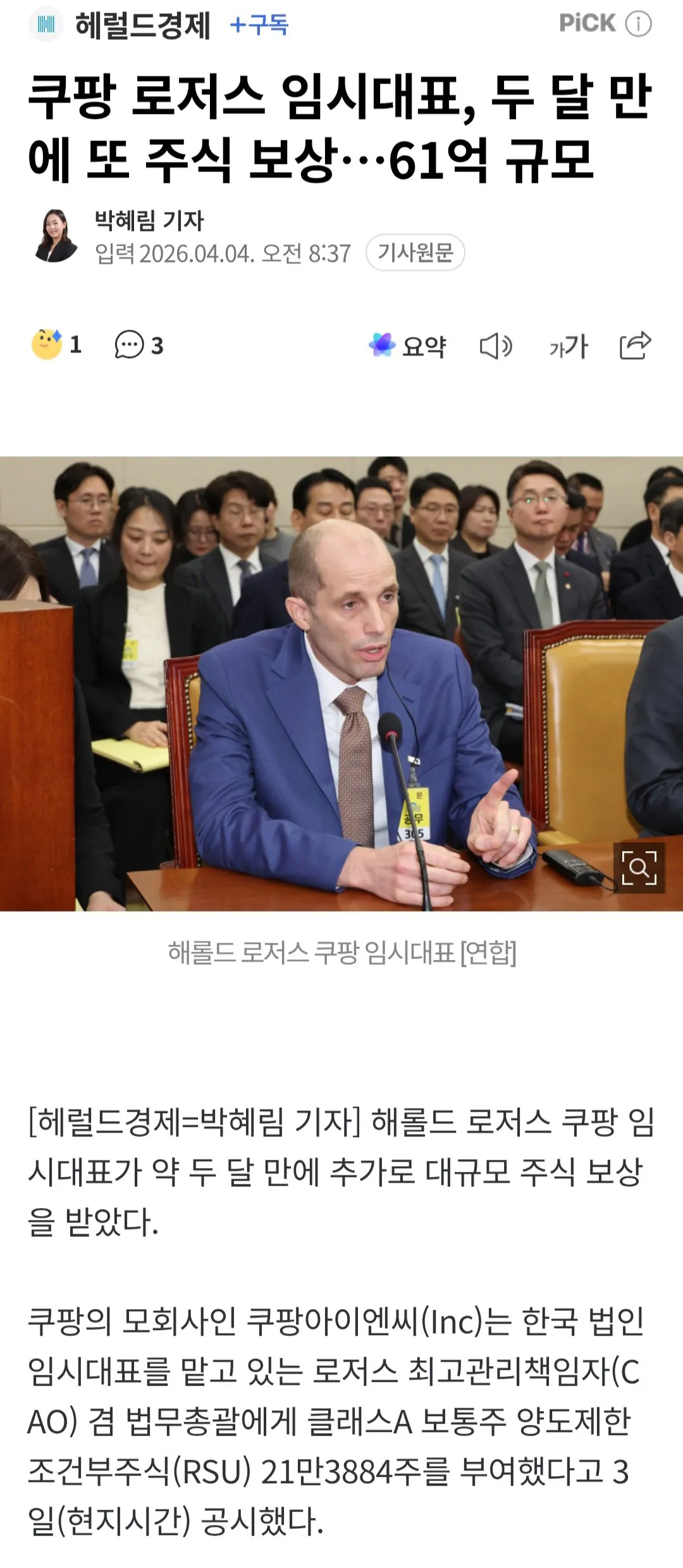 경제쿠팡 로저스 임시대표, 두 달 만에 또 주식 보상…61억 규모 |