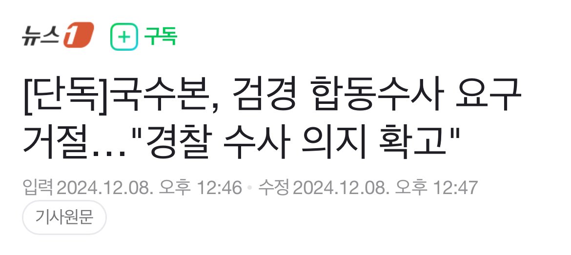 https://n.news.naver.com/mnews/article/421/0007953717?rc=N&ntype=RANKING&sid=001 경찰 일각에서는 검경 합수본의 필요성이 제기되지만 국수본 관계자는 "현재까지는 검경 합동수사본부 설치는 주요 논의 대상이 아니다"며 "내란죄는 경찰만이 수사할 수 있다"고 선을 그었다. 까놓고 검찰 끼면 좀... 0