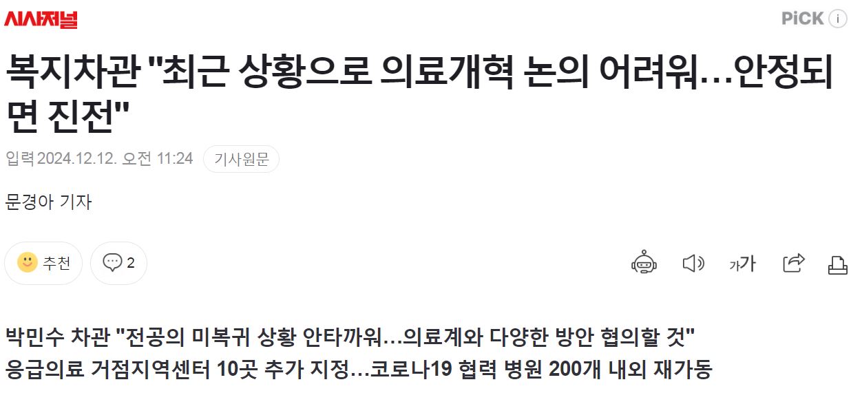 Subject   복지차관 "최근 상황으로 의료개혁 논의 어려워…안정되면 진전"