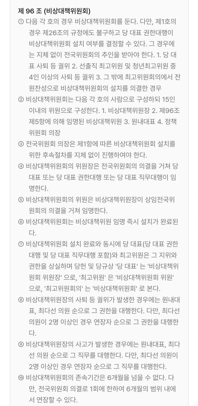 친한동훈(친한)계인 박상수 국민의힘 대변인은 이날 사회관계망서비스(SNS)에 “당헌 제96조 제1항은 비대위 구성 요건을 두고 있으며, 제4항은 비대위원장은 당대표 또는 당대표 권한대행이 임명하는 것으로 규정하고 있다”면서 “최고위원 4인 사퇴는 당대표 권한대행 또는 직무대행 발동 요건이 아니라 비대위 구성 요건이며, 이에 비대위원장 임명 권한으로 당대표를 두고 있는 것”이라고 밝혔다. 그는 이어 “당대표는 아직 사퇴하지 않았으므로 당대표 권한대행은 성립될 수 없다”며 “당헌 상 당대표 권한대행은 당대표 사퇴나 궐위시 가능하다”고 했다.