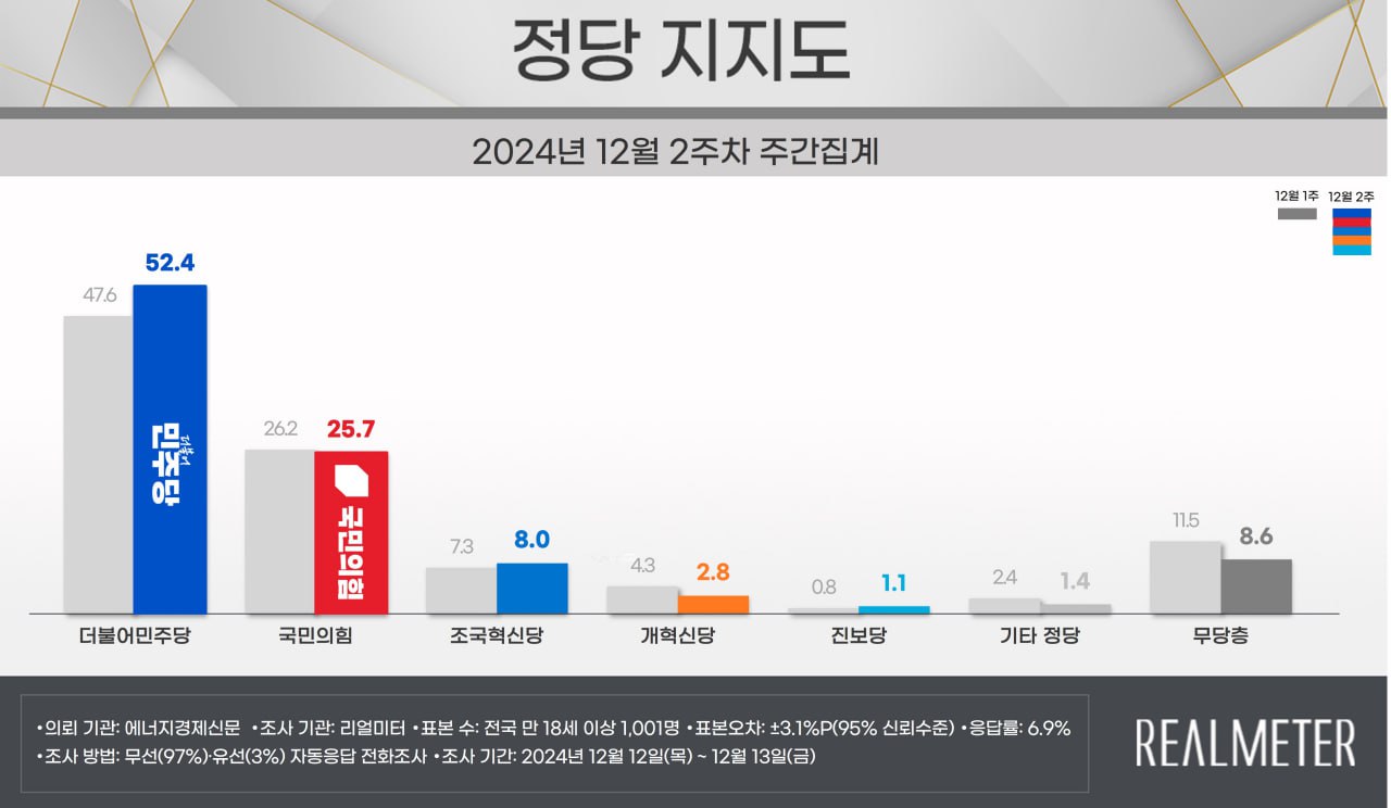 655 정치리얼미터, 민주 52.4%(▲4.8%p), 국힘 25.7%(▼0.5%p), 양당간 격차 최대치 경신 10 매뉴물있뉴 24/12/16 4139 0