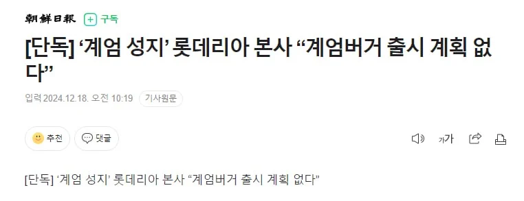 | Subject | '계엄성지' 롯데리아 본사 "계엄버거 출시 계획 없다" |
