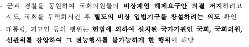 저기 별도의 비상입법기구를 창설할 의도가 확인되었다는 저 문구도 잘 보시면, 선관위에는 저런 표현 안썼습니다. 이거, 그냥 국회를 무력화하려고 했다는 얘기가 아닙니다. 국회를 무력화한뒤에 뭔가를 새로 창설하려고 했단 얘깁니다. 정부를 참칭하려는 목적을 확인했다는 얘기를 돌려 말하고 있는것 같습니다. 국회는 정부의 최중요 3부중 하나인 입법부인데 그걸 하나 더 별도로 창설하려고 했다고 하면..