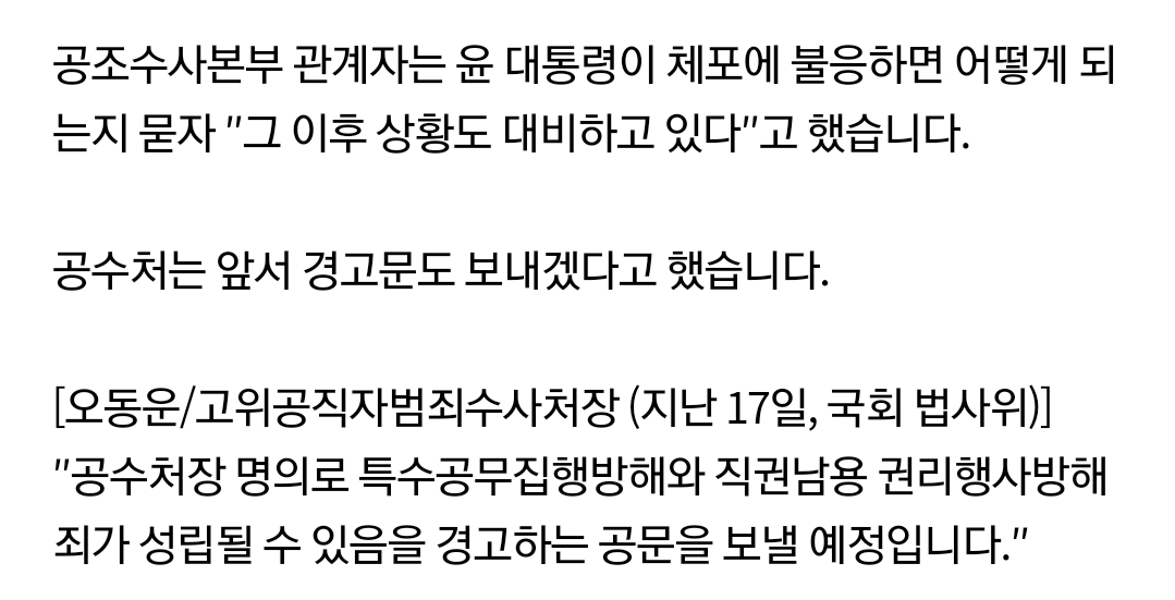 대통령경호처에 영장 집행 방해 시 공무집행방해에 해당한다는 경고 공문을 보내는 방안과 관련해서?