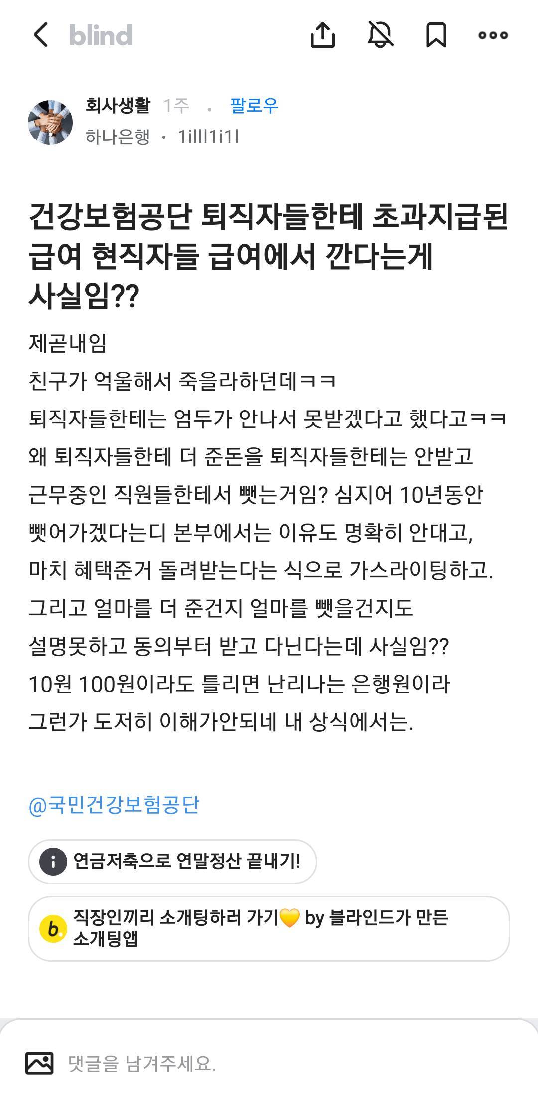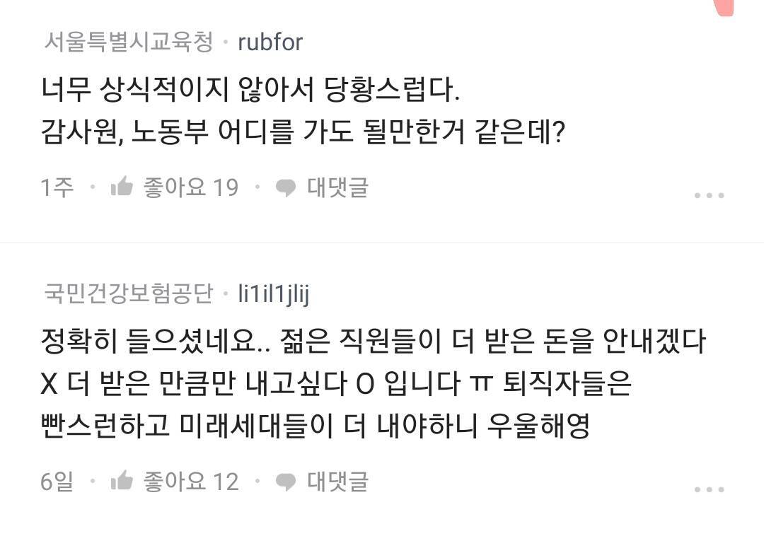 일단 선 다섯줄 요약입니다. 1. 올해 건보에 입사를 했으나 입사하자마자 과거에 7~8년동안 부정하게 많이 올린 급여를 메꾸기 위해 전 직원 12년 임금동결이 시행됨. 2. 신입사원 입장에서는 공시된 초봉 및 앞으로 오를 급여를 보고 입사했는데 공시된 초봉은 부정하게 올린 급여였고 그걸 메꾸기 위해 전직원 12년 임금동결을 한다고 하니 취업사기를 당한 심정임 3. 임금이 12년 동결될줄 미리 알았으면 다른 선택지를 했을것. 공시되었던 초봉이 높았으니 그만큼 취준생들 선호도가 높아져 입사경쟁률도 쌨는데 그렇게 힘들게 입사했고, 당연히 기대되던 임금에 대한 부분을 나와 관련없는 잘못으로 동결한다고 하니 박탈감이 큼. 연봉동결 얘기가 퍼진 취업커뮤니티에서는 당연히 선호도 급락중임. 4. 더불어 환수방식에 대한 불만이 있음. 작년 퇴직자는 부정하게 오른급여 받을거 다받고 손해보는거 없이 퇴직했으며 올해 신규직원은 올해 입사해서 부정하게 받은것 하나없는데 손해는 다 보는것임. 5. 하지만 현실적으로 신규직원은 힘도 없고 아무도 챙겨주지도 않고 이직말고는 할수 있는게 없어서 더 답답함. 2년동안 준비해서 올해 국민건강보험공단에 취업을 했습니다. 취업한 이유는 공기업중에서 매년 임금상승률도 높았고 초봉도 높고 워라밸좋고 제 집근처에서 근무 가능한 공기업이 건보가 유일했어요. 그래서 열심히 준비했구요. 올해 7월에 붙고나서 너무너무 기뻤습니다. 치열하게 업무에 적응하느라 노력하는데, 올해 12월 청천벽력같은 소식이 들렸습니다. 아직까지 7~8년동안 급여를 부정하게 올렸다는게 기재부 및 감사에 들켰으니, 그 댓가로 향후 12년간 임금동결을 하겠다는 내용이였습니다. 현재 신입 초봉은 4100만원인데 급여를 부정하게 올리지 않았다면 신입 초봉은 지금보다 600만원 가량 낮은, 3500만원이여야 한다는 겁니다. 그리고 부정하게 올린 600만원의 갭을 줄이기 위해 향후 12년간 호봉으로 인한 임금상승분을 제외하고 전직원 임금동결을 하겠다는 얘기입니다. 이에 관해서 경영진들은, '신입사원은 원래 초봉으로 3500만원을 받아야하는데 4100만원 받고있으니 혜택을 받고있는 것이다. 혜택받았으니 신입사원도 부당하게 올린 급여에 대한 책임이 있다.' 라고 말하며 입닫고 있는 상황입니다. 저는 현재까지 진행상황이 너무나도 화가나고, 힘듭니다. https://www.dailymedi.com/news/news_view.php?wr_id=919789 관련 기사내용입니다. 제가 화가 나는 이유는 1. 올해 입사한 신입사원은 잘못한것 하나없고 혜택받은것도 없는데 경영진에게 '초봉을 많이 올렸으니 신입사원들도 혜택을 받았다' 이라는 얘기를 들었고, 다른 사번과 똑같이 12년 동결을 받는게 너무 억울합니다. 저는 입사전에 12년 임금동결 받는줄 알았으면 다른기업 준비했을겁니다. 심지어 4달전 연수원에서 상임이사가 와서 '우리가 임금 많이 올렸으니 자부심 가져라' 등등의 말도 하고 갔습니다. 2. 모든 공무원, 공기업은 호봉상승분을 제외하고 매년 물가상승률에 기반한 정부의 가이드라인에 따라 1~3% 사이 임금을 올리고 있고 당연히 건강보험공단에 입사할때 매년 1~3% 내지의 임금상승을 기대하고 왔는데, 12년동안 임금동결이라 하니 사실상 취업사기라고 생각합니다. 매년 물가 상승률이 매년 2~3%사이인데 호봉 상승분 제외 임금동결이면 사실상의 임금하락이기 때문입니다. -> 근데 이에 관해, 매년 1~3% 가량의 임금상승은 근로계약서상 약속한게 아니기때문에 법적으로 다퉈볼만한 여지도 없다고 합니다. 솔직히 매년 임금상승을 사측이 약속한건 아니지만, 공무원 및 공기업은 매년 올라가는 급여와 안정성정도는 당연히 생각하고 오는거라고 생각하는데 말이죠.. 실제로도 모든 공무원 및 공공기관이 매년 급여를 소량 올리고 있으니까요. 3. 신입사원의 말을 귀기울여 들어주는 사람은 극소수고, 힘도 없으니 당할수밖에 없습니다. 내가 뭘 할수 있는게 없습니다. 이직하기에는 건강보험공단 맞춤 경력 및 스펙이라 낙장불입같은 느낌입니다. 4. 사내 블라인드에서는 다들 임금동결에 대한 한탄이 많지만, 가장 피해가 큰 신입사원들에 대해 '꼬우면 이직해라, 너만 피해봤냐, 이 직장 너가 선택하지 않았냐, 너네 입장은 알겠는데 자꾸 얘기하니 피곤하다' 등등 정말 정떨어지는 얘기를 많이 듣고있습니다. 솔직히 임금에 관하여 부정하게 취한게 있으면 이득본 사람이 내야하는게 맞다고 생각합니다. 그렇다고 하면 윗사번일수록 많이 부담하고, 아랫사번으로 갈수록 적게 부담하는게 이성적인 진행방향이구요. 근데 이걸 신규사원 포함 모두에게 똑같이 부담하라고 하니 너무너무 분한겁니다. 심지어 신규사원은 그냥 24년 공시된 초봉보고 입사한건데, 들어오고나니 연봉동결이라고 하니 화딱지가 납니다. 그래서 요즘 정말로 일하기가 싫어지고 윗사람들에 대한 정이 떨어지고 블라인드 사내게시판 보면 사우들에 대한 배신감도 들고 힘든 요즘입니다. 저는 진심으로 취업사기라고 생각하는데, 제가 잘못된 생각인가요? 이런얘기 부모님한테 말하니까 '너가 뭘 바꿀순 없으니까 그냥 순응해라' 등등의 얘기만 들리고 현실적