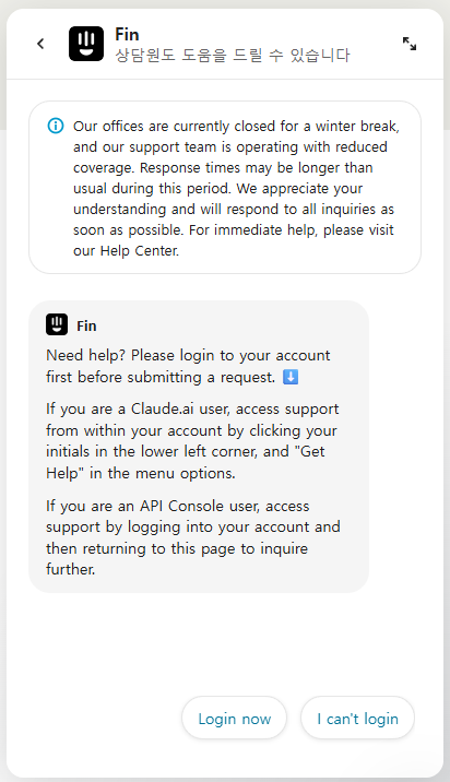월간결제를 해야 하는데 클릭미스로 연간결제를 해 버려서 취소 및 환불을 해야 하는데... 이 클로드 고객센터가 골아프더라고요 일단 기본적으로 클로드 웹서비스 들어가서 좌하단 프로필 > 도움 받기에 들어가면 채팅창 같은 것이 뜨는데 Fin 이라는 자체 AI 챗봇이 상담을 해줍니다. 그래서 환불하고 싶다 하니 자료를 달라 해서 구매영수증 등등 첨부해서 보내니 인간 담당자에게 전달한 뒤 메일 주겠다는게 무려 20일 전입니다. 그 뒤로 아무 반응이 없어요 더 기막힌건 채팅창에 채팅을 쳐도 AI 챗봇인 Fin 도 아무 답이 없다는겁니다. 새로운 대화창을 열거나 하지도 못해요. 기다려도 감감무소식이라 Anthropic Support Team(support@mail.anthropic.com) 에 직접 메일을 보내봤지만 역시 감감무소식입니다. 20일동안 약 3일 간격으로 계속 문의메일을 넣어보고 있지만 먹통입니다. Anthropic Support 페이지에 들어가면 우하단에 또 다른 문의하기 버튼이 있어서 클릭해보면 첨부한 파일과 같은 채팅창에 뜨는데, 무슨 winter break 라서 답이 늦어질수 있다는 한가한 소리를 하고 있습니다. 이게 정말인지 무슨 버그로 옛날 공지가 계속 뜨는건지는 모르겠는데 5월말에 무슨 winter break 인지 모르겠습니다. 아무튼 여기에서는 문의를 할 수 없고 클로드로 로그인해야 하는데 그럼 아무 답 없는 Fin 챗봇으로 회귀합니다. 아니 무슨 소규모 중소기업 홈페이지면 모를까 클로드 정도면 전세계에서 쓰는 AI 서비스인데 환불 절차를 돕는 서비스센터가 왜 이모양인지 도통 모르겠네요 제가 뭔가 잘못하고 있는 걸까요? 도움 주시면 감사하겠습니다. 0