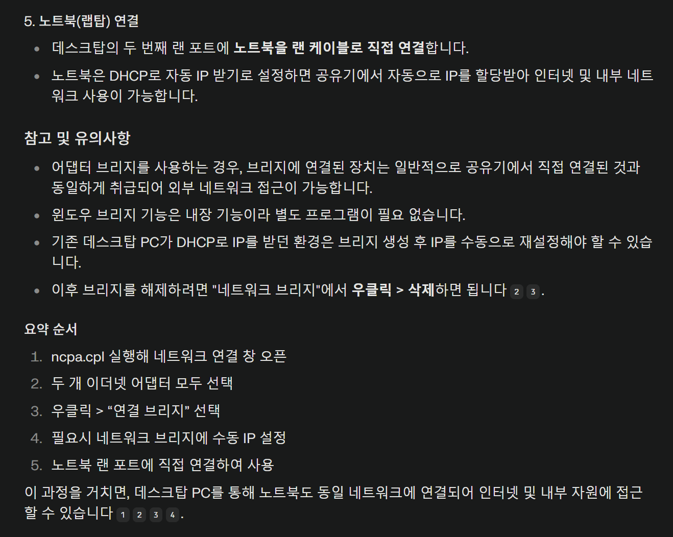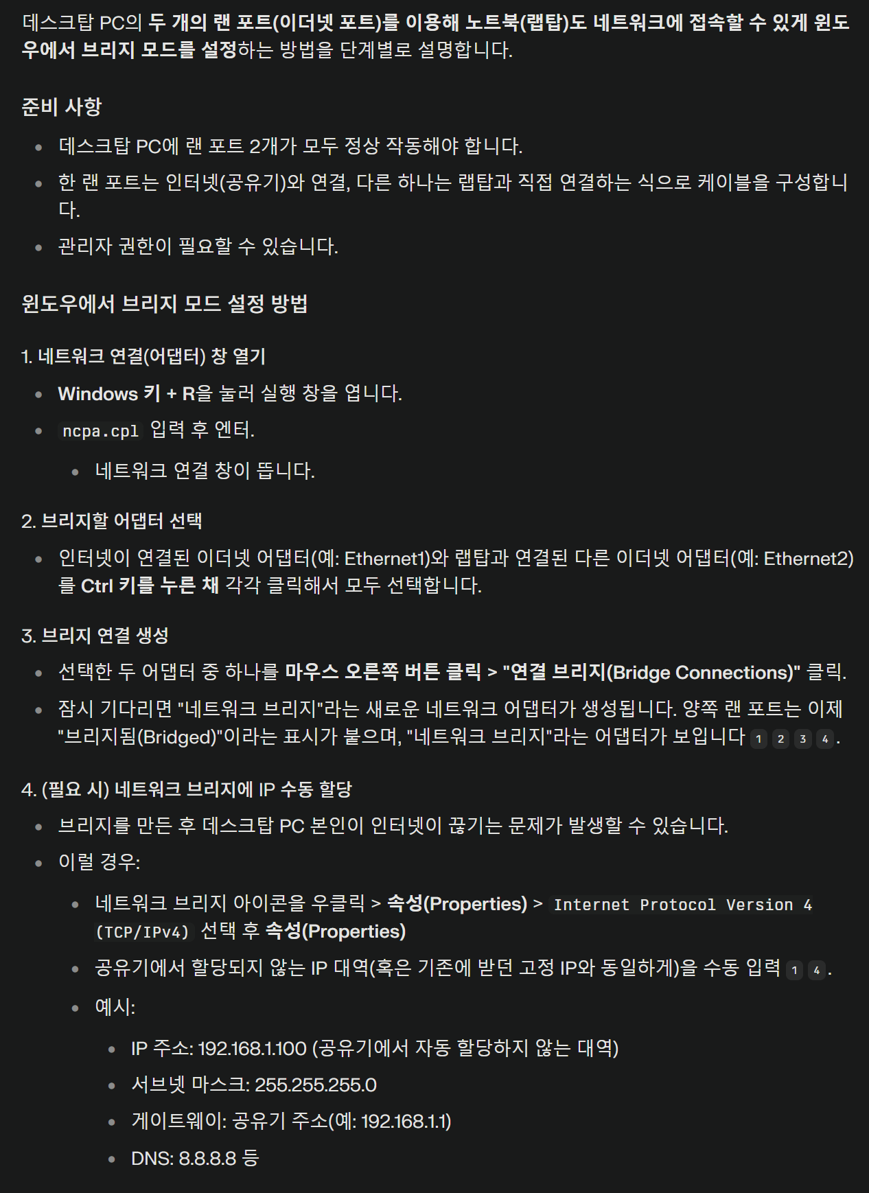 지금 랩탑 데스크탑을 쓰는데 유선망을 랩탑과 데스크탑 번갈아가며 써야합니다. 동시에 쓸 필요는 없지만 기기에 부여된 ip에 특정 프로그램이 방화벽 예외라 공유기처럼 자체적으로 ip를 받아 다른 기기로 뿌려주는 기기는 이용하기 어렵습니다. (제가 이해한 것이 맞을까요? ㅎㅎ) 벽 패널 랜포트는 하나여서 랜선을 물리적으로 바꿔끼고 있는데 이걸 편하게 해줄 장치를 찾고 있습니다. 단순하게는 rj45 female-female 커넥터를 사서 책상 위에서 바꾸어 끼는게 1차적 해결책이지만 물리 스위치로 바꾸어 주는 게 있으면 좋을 것 같습니다.