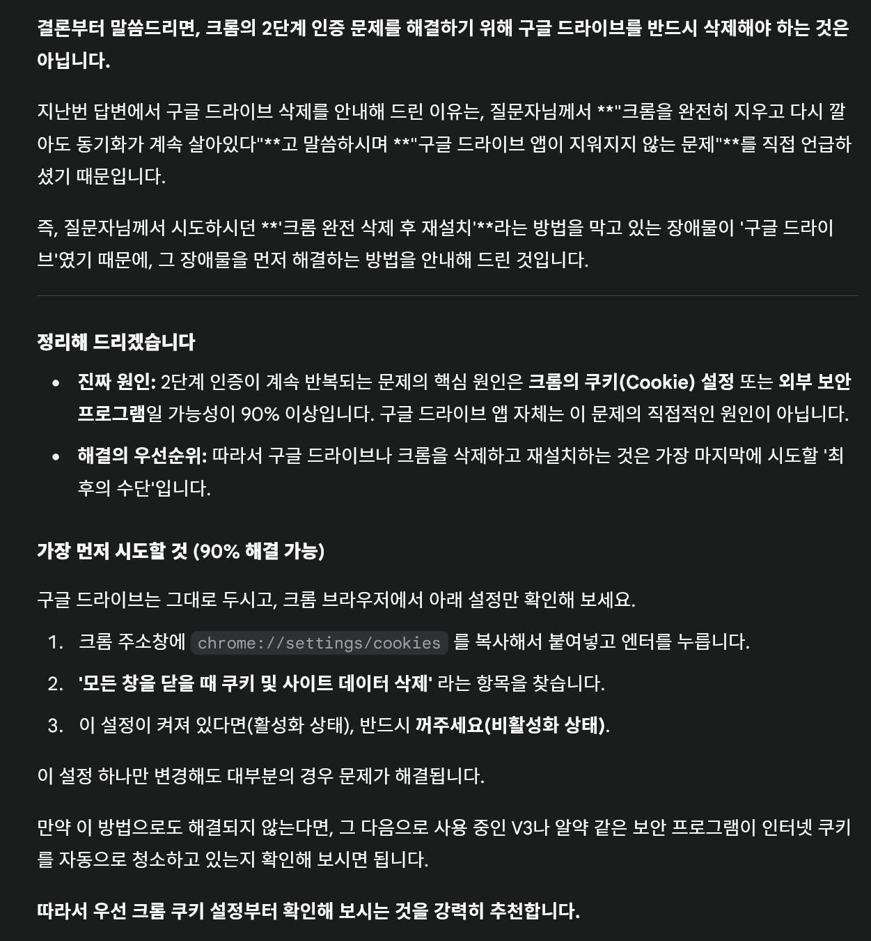 컴퓨터에서 2단계인증이 어떻게 돌아가고 있는지 특정 pc에서 계속 2단계인증이 동작해, 로그인할때마다 계속 인증을 해야 합니다. 컴이 절전모드 걸렸다가 풀리거나, 크롬 창을 껐다가 켜도 인증을 해야 하고요.. 아무리 이 기계에서 앞으로 2단계 인증 사용 안함을 체크해도 소용이 없어요. 그래서 크롬을 완전 지우고 깔아보려고 하는데, 구글드라이브를 안 지우고 다시 크롬만 깔아서 그런지 크롬 동기화가 계속 살아있어요.... 그리고 구글 드라이브를 지우려고 하면 동기화가 풀리지를 않아서 드라이브 앱이 지워지지 않습니다 ㅠㅠ 어떻게 해야 구글드라이브 앱을 지우고 다시 깔 수 있을까요?ㅠㅠ 0