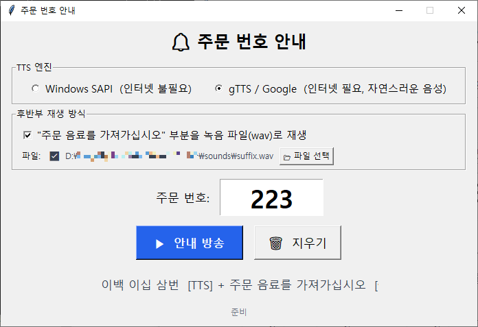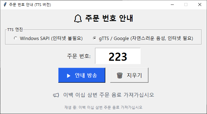 바깥에 스피커는 설치되어 있어서 포스 기계(윈도우 사용하는 기계입니다)를 통해 스피커로 ‘00번 주문 음료 가져 가십시오’ 정도만 출력이 되면 될 거 같은데 찾아봐도 그냥 TTS 이야기만 나오고 제가 원하는 정도의 프로그램이 없더라구요.