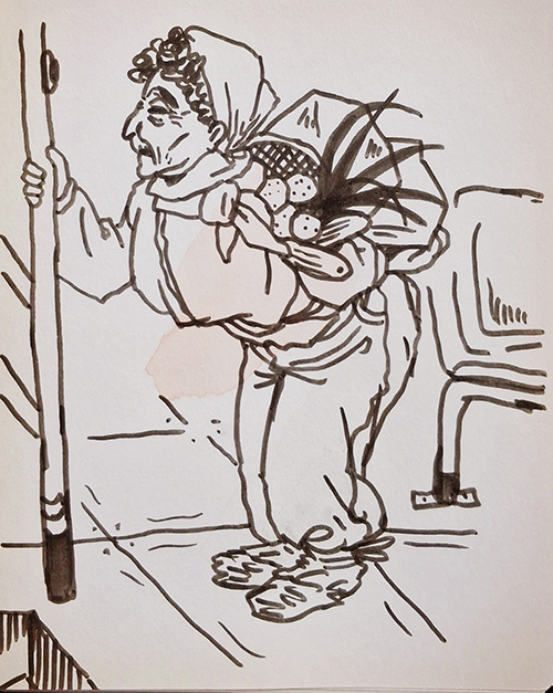 등에 짐이 많아보여요. 장을 보신 걸까요? 대파와 감자, 기타 비닐봉투뭉치가 엄청나게 많아요.