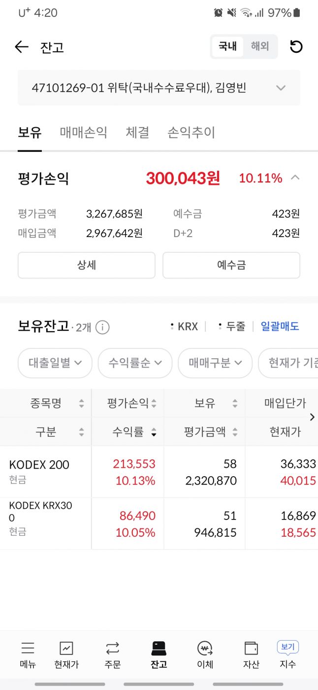 국장 인덱스 투자 3개월차 3개월 수익률 10% 오우야 원금 절반은 이재명 당선되고 추가로 넣은거라 3개월 전 원금만 보면 수익률은 더 높아짐. 타이밍 완벽하게 고른 듯? 10