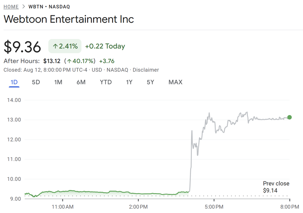 https://g.co/finance/WBTN:NASDAQ 개인적으로 웹툰, 웹소설쪽을 호감까지 더해서 가능성이 높은 시장이라 보고 있는데, 아직 단독종목은 이거 빼고는 없어서 소소하게 정찰만 보내놨거든요. 솔직히 상승흐름 탈려면 시간은 걸리겠지 하고 있었는데 실적이 예상을 상회했다네요. 는 디즈니랑 계약 얘기가? 3
