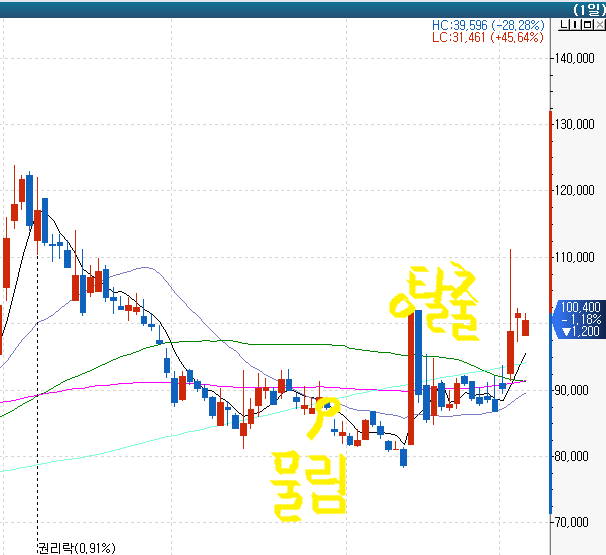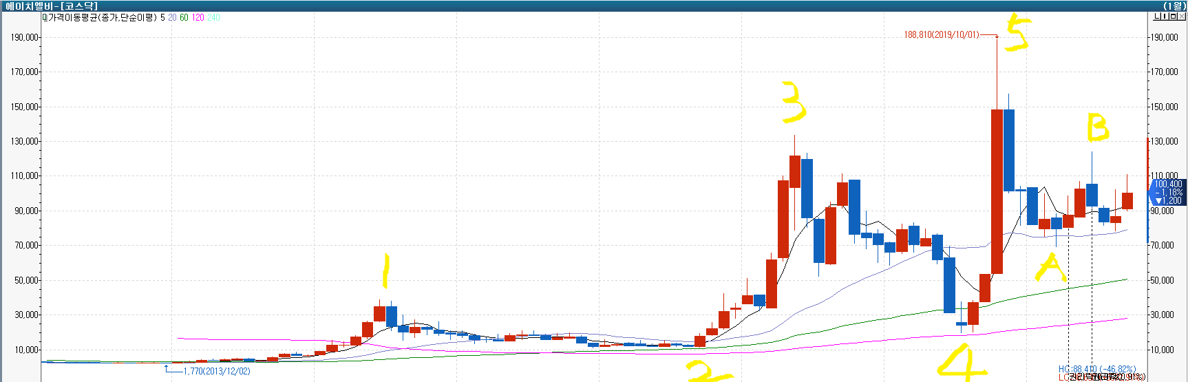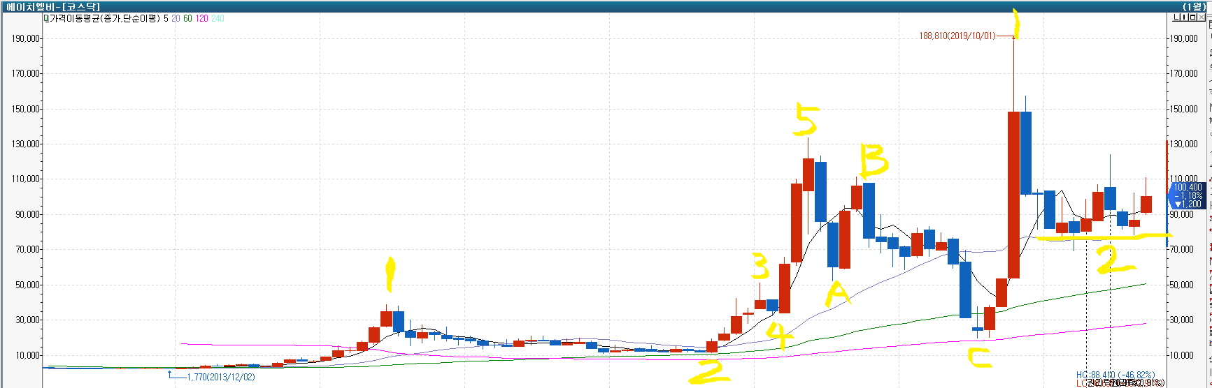 엘리어트 파동은 상승할때 상승1 조정2 상승3 조정4 상승5 로 최고점을 찍은 후 하락A 반등B 하락C로 최저점을 찍고 다시 상승1부터 시작한다는 이론인데 신빙성이 얼마나 있는지는 잘 모르겠어요. 제가 에이치엘비라는 하락세의 바이오 종목을 주시하고 있다가 7월14일 8만1천원에서 7월21일 9만1천원까지 반등하는 것을 보고 추세전환 하는건가 싶어 7월29일 종가 8만7천원이 눌림목이라 판단하고 매수했습니다. 그런데 바로 다음날에 머 테스트 신청한게 있었는데 자료보완하느라고 한달 연기했다나 대충 그런 악재가 터져서 7만원대로 추락.. ㅋ -15% 손실중인 와중에 8월13일 간암치료제 임상3상 승인 소식에 상한가를 쳐서 +15% 수익을 보고 탈출할 수 있었습니다. 하루하루가 이렇게 다이나믹한 종목인데 월봉으로 크게 보았을 때 만약 엘리어트 파동이 맞는다고 하면 20만원을 넘어가야 하거든요.. 과연 이게 가능한 일인지? 이게 되면 지금 십몇퍼 오르내리는거는 정말 사소하게 느껴질텐데.. ㅋ 일단 장미빛 희망에 가득 부푼 뉴스들은 쏟아지는 중이긴 한데 바이오란 놈들이 언제 뒤통수 칠지 모르고 나스닥까지 불안한 상황에 어케될지 모르겠네요ㅋ 매매는 위험한거 같고 개인적으로 투비소프트때처럼 재미있게 관전할만한 종목이라 소개해 봅니다ㅋ 0