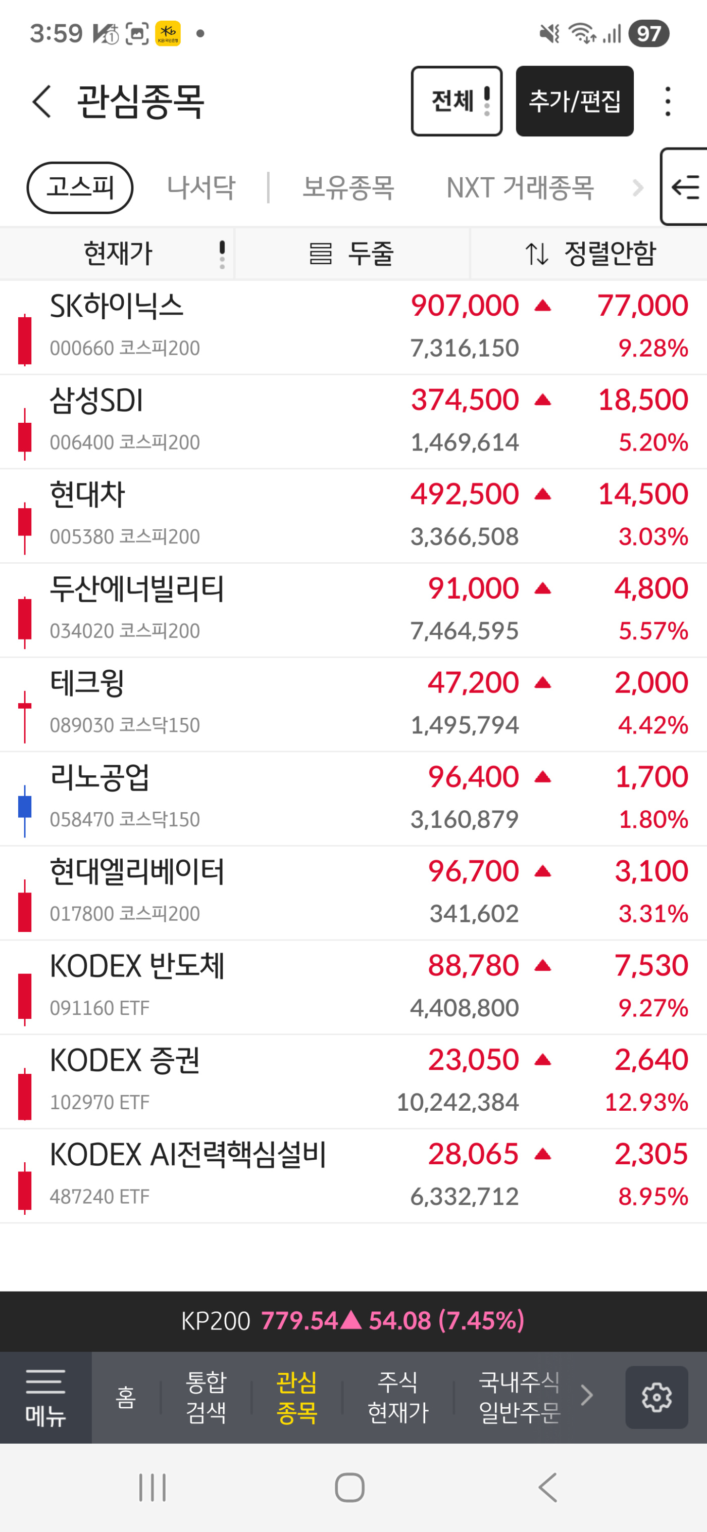 관심종목 변경공지 Out 네이버 - 말이 필요없읍니다. 숙청. 알테오젠 - 제가 바이오를 전혀 모르는데다가 관심이 잘 안가더군요. ㅂㅂ. IN 현대엘리베이터 - 배당도 잘주는데 무빙이 미쳤던.. KODEX 반도체 - 아마 관심종목 운영을 좀 바꿀거 같은데, 하이닉스 외 종목은 전부 섹터로 보는 걸로 대신할까 생각. 3