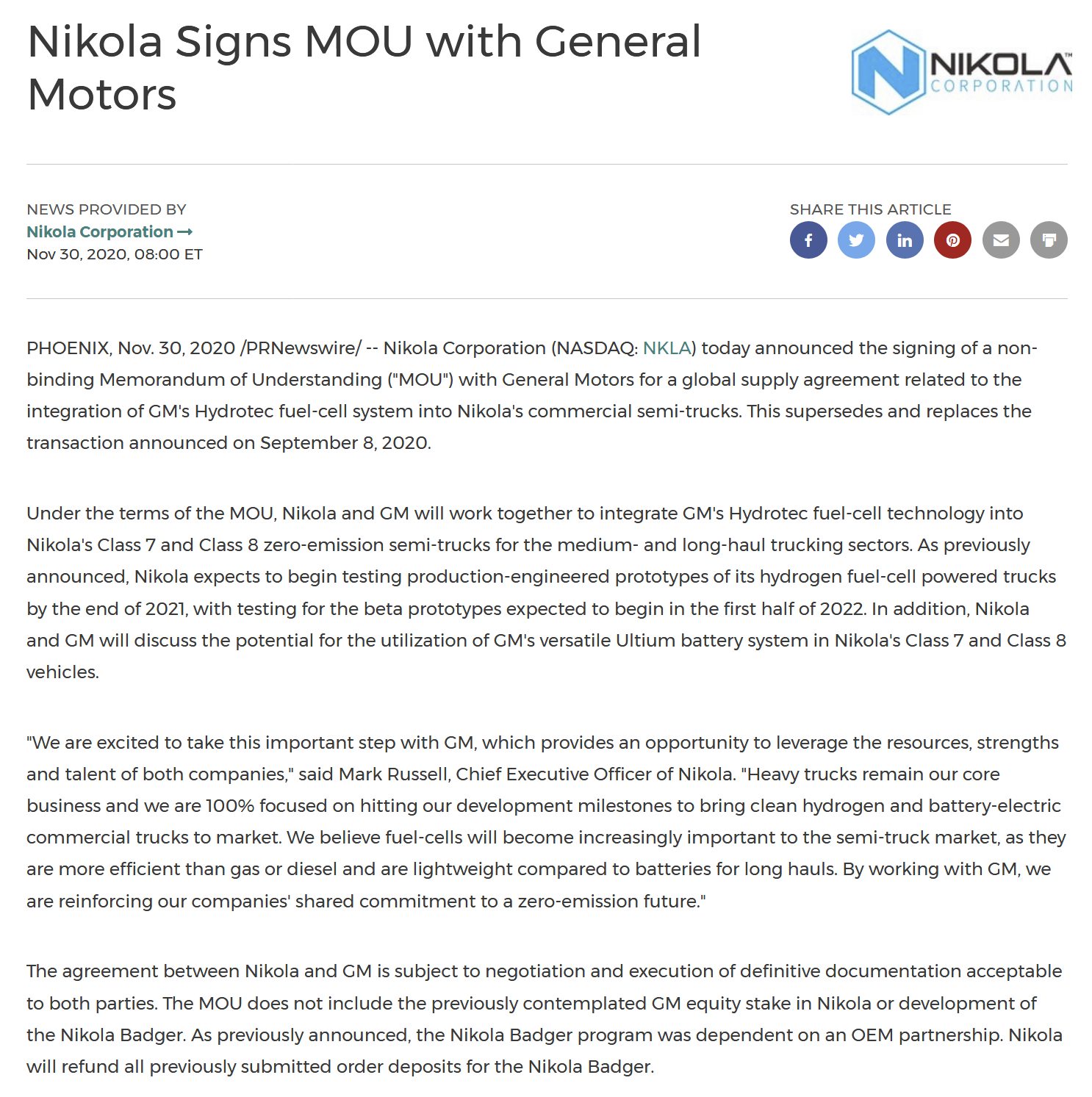 GM과 MOU를 맺었다고... https://www.prnewswire.com/news-releases/nikola-signs-mou-with-general-motors-301181397.html 참고로, 오늘 보호예수 풀리는 날입니다. 대놓고 하는 듯? ㅡㅡㅡ GM, '사기 논란' 니콜라 지분인수 포기…니콜라 주가 27% 폭락(종합) https://www.yna.co.kr/view/AKR20201201003451072 0