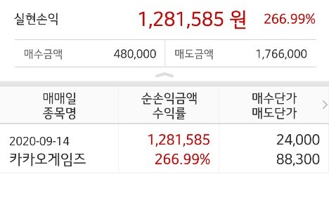 제가 카카오게임즈 공모로 올린 수익인데 다시 하라면 안할겁니다...투자금 대비 수익이 별로에요.