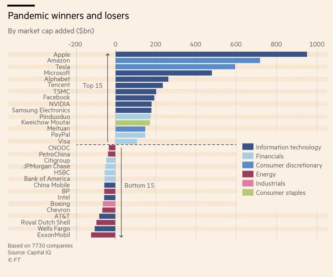 위는 시총액 변화로 아래는 시총 퍼센티지 변화로 Prospering in the pandemic: 2020’s top 100 companies The final ranking of corporate winners in a devastating year (유료) https://on.ft.com/34ZFyYt 1
