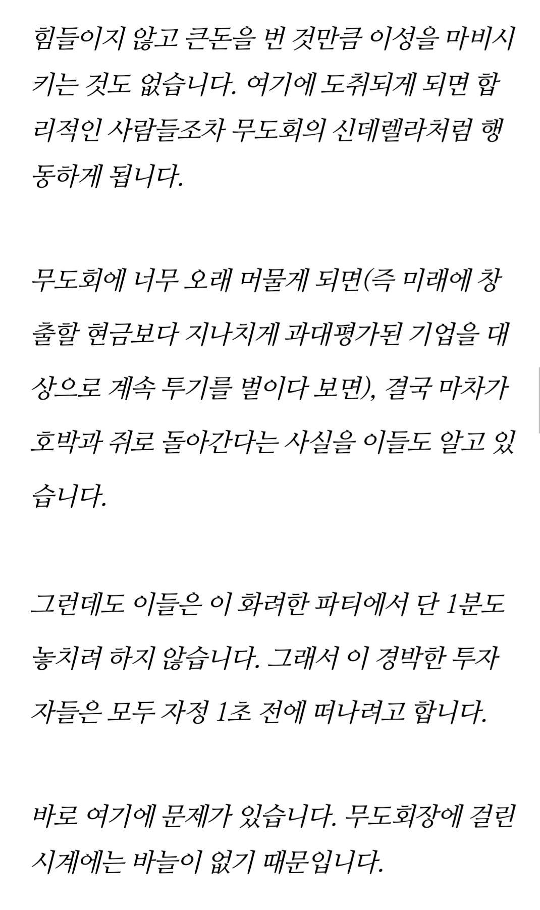 버핏 옹의 서한이였는지 메모였는지 남긴 글입니다.요즘같은 강세장에서 우리가 주의해야할 점입니다.이 무도회가 언제 끝날지 모르거든요.여기에 시계는 존재하지 않기 때문. 매도하기전까진 수익률이 몇 퍼인지 따질필요가 없습니다.오르는 속도에 비해 빠지는 속도는..MDD는 정말 갑자기 찾아오거든요.강세장이 일정이상 진행되고나면 우리는 언제든 조정,약세장을 준비해야합니다. 특히 올해의 시장처럼 유동성공급에 의해 모든 자산군이 출렁이는 시기엔 말이죠.언제 공급이 끝날지 모르기 때문에... 저또한 이에 대한 대책을 세울 방법을 강구하고 있습니다.언제인지 알 수 없으니, 미리 매도에 관한 트리거를 설정해둬야죠.일정 조건 만족시 반드시 매도. 안전자산과 찾아올 인플레에 대비한 IAU매수? 비트코인? 아 찾아보니 다들 헷지로는 굉장히 불안하군요..차라리 인버스? 또 공부할게 생겼네요 ㅎ 0