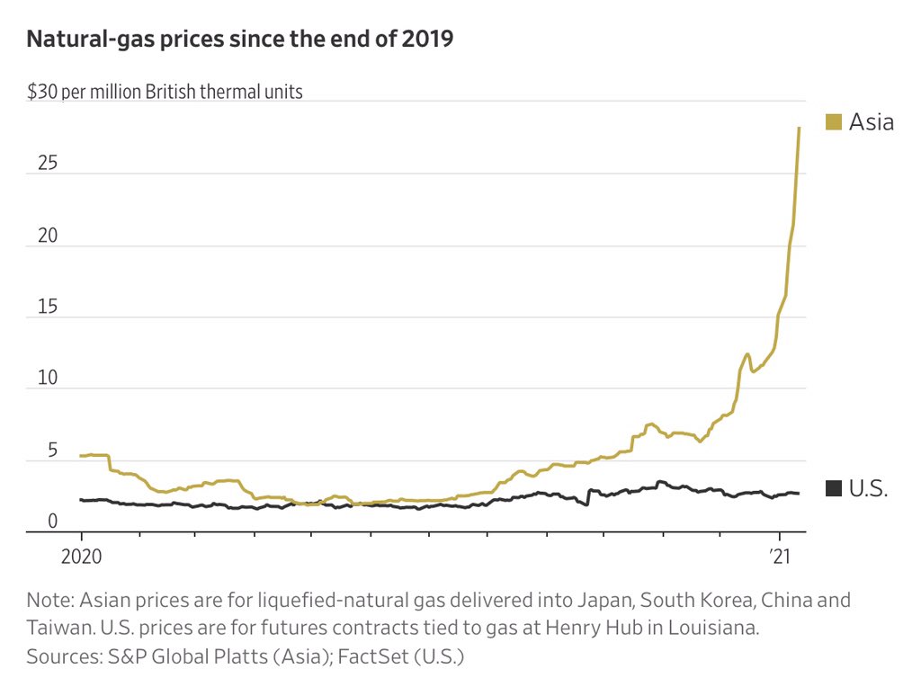 그렇게 되어 버렸죠. (동아시아) LNG 가격을 몇 번 소개했는데, 오늘 Total이 Trafigura(;유명 트레이딩 회사)에 2월 11일~15일 중국 인도분 LNG를 39.3달러/MMBTU에 팔았다고 합니다. 코로나19 터지고 하면서 작년 4월이 JKM(Japan Korea Marker) 기준 역대 최저가(1.7~1.8달러/MMBTU)였는데, 지금은 계속 역대 최고가를 경신하고 있습니다. 1월 8일에 소개했을 때가 20달러를 넘겼었습니다. 쉽게 생각해서 갑자기 폭설 내린 서울 시내 퇴근 시간에 따블(?) 불러서 택시 잡는 느낌이랄까요? 가격이 문제가 아니라 배(화물)가 없... 올겨울은 추울 것?! https://new.redtea.kr/?b=39&n=1021 Jパワー、石炭火力を重油で緊急再稼働 電力逼迫で https://www.nikkei.com/article/DGXZQODZ121VV0S1A110C2000000 電力の需給状況と節電へのご協力のお願いについて https://www.kyuden.co.jp/td_press_2021_210110.html 일본의 경우는 전력수요가 폭증하면서 설비 고장 등으로 정지된 석탄화력발전소에서 중유를 이용해 긴급 발전할 예정이라고 합니다. 우리나라도 지난주 한파에 전력수요가 급증했었죠. 일본은 전력도매가도 급상승하고, 절전 요청하고, 난리라고. 한편 북극한파와 관련해서는 조금 지난 기사지만, https://www.washingtonpost.com/weather/2021/01/05/polar-vortex-split-cold-snow/ 중국, 한국 등은 이미 겪었지만, 미국, 유럽 등 다른 북반구도 평년 기온으로 내려간 이후에는 북극 한파가 엄습할 가능성이 얘기되고 있습니다. 0
