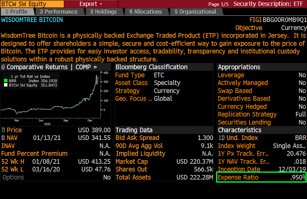 참고로 스위스에 상장된 BTCW(위즈덤트리) ETP 수수료가 0.95%입니다.