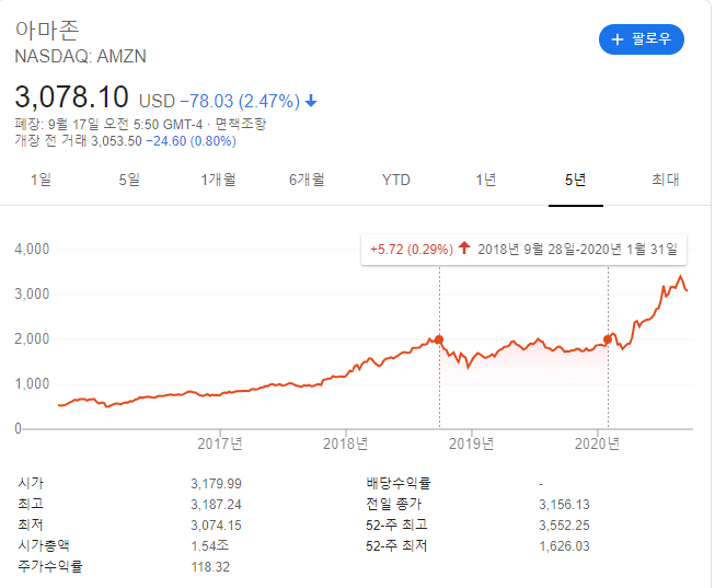 천하의 아마존이고 뭐고 시장이 비싸다고 판단하면 비싼 겁니다. 이 글은 예전부터 미장을 해오시던 분 글에서 사실 발췌한 거에 가까운데, 그분의 말로는 이렇다고 합니다. 2018년 하반기부터 기술주 부진이 지속되고, 2019년 아마존이 전국 당일배송을 준비하던 때 1년 3개월간 아마존 주가는 횡보만 했읍니다. 이 기간동안 커뮤니티에서 아마존은 똥마존이라고 말이 많았다고 합니다. 2월에 슈팅 좀 하려니까 코로나로 더 쳐맞았읍니다. 하지만 코로나 이후 아마존 주가는 5개월간 2배까지 뛰었지요. 당장의 주가는 어떻게 될지 모릅니다. 앞자리 2자 볼 수도 있겠지요. 하지만 지금은 아마존의 미래만을 볼 때가 아닌가 합니다. 어차피 저는 개별주 1,2개+지수추종 ETF쪽으로 방향을 정한 이상, 아마존이 지금 죽어라 인원을 고용하고 웨어하우스를 뚝딱했을 때, 이게 헛된 투자인지, 아니면 경쟁업체들을 전부 Amazoned하면서 또 한 번의 비상을 할 때인지, 미국 자체의 동력은 살아있는지 등을 계속 다시 점검해봐야겠읍니다. 0