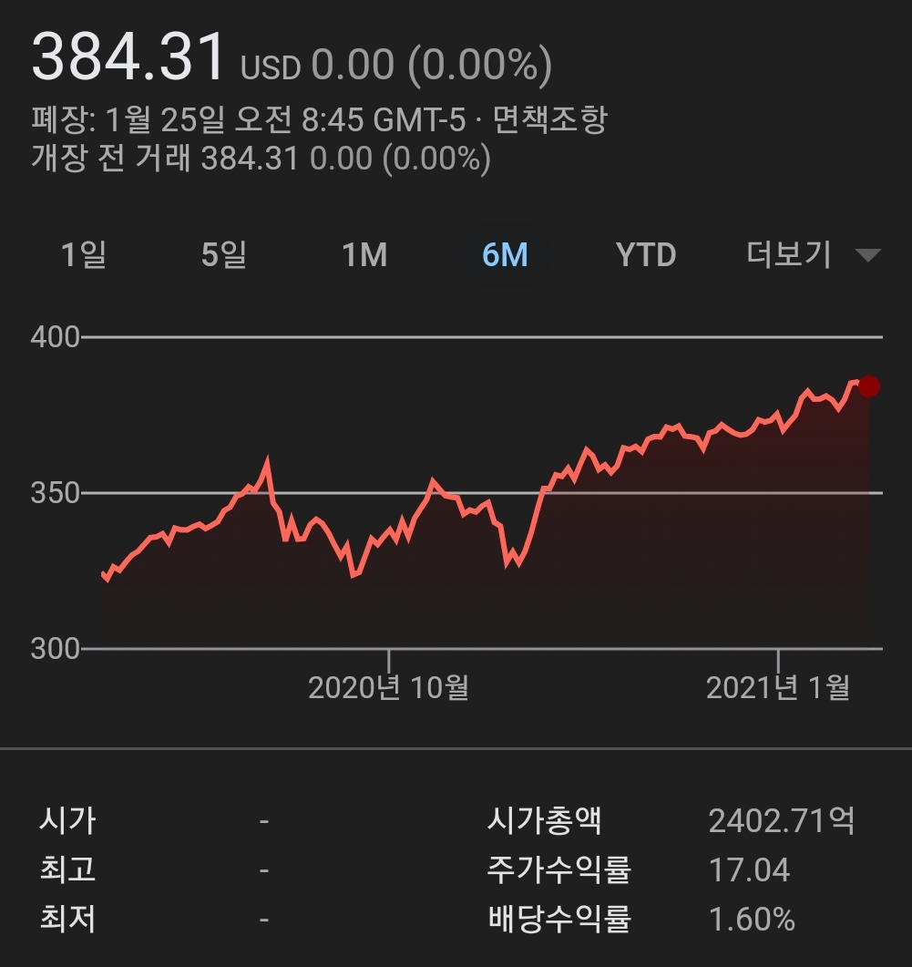 한 달마다 $365, $370, $384.31에 1주씩 샀습니다. 현재가는 $385네요. 무난하게 별 신경 안 쓰고 계속 사기엔 편합니다. 0
