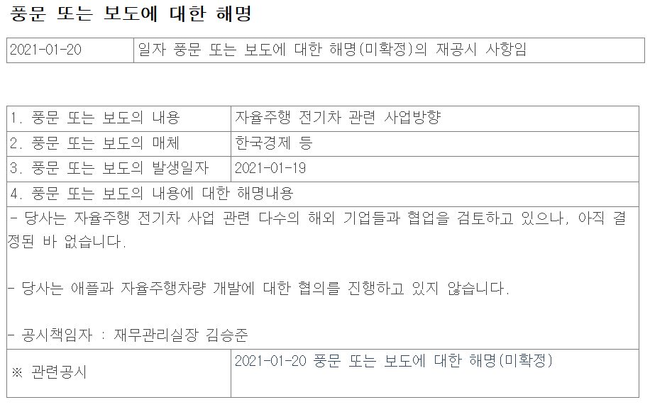 기아자동차는 1월 20일 이후 두 번째 공시군요. 현대자동차는 1월 8일 이후 한 달만의 공시. (당시 1개월 이내 재공시하겠다고 했었죠) https://dart.fss.or.kr/dsaf001/main.do?rcpNo=20210208800103 0