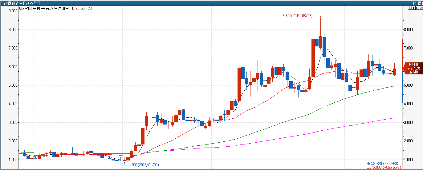 패션섹터 시총 5천억 roe 22 per 8 매출 영익 점진적 우상향중 일단 재무가 좋고 월봉이 아프리카TV 슈팅 직전 모습과 너무 닮아 있어서 가져와 봤읍니다ㅋ 위에가 아프리카TV 이고 아래가 코웰패션 0