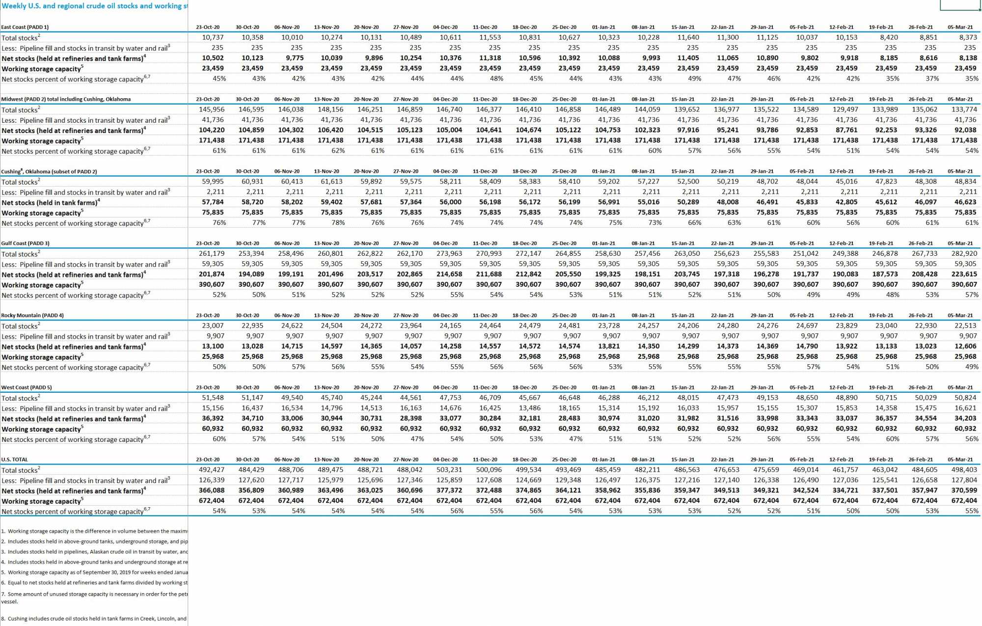 Price Change라고 나오지만, Price 아니고, 재고량(barrels) 입니다. 한파로 공급(생산/물류)과 수요 다 영향을 받아서입니다만, 2주 단위로는 최소 근 30년 래 최대폭으로 떨어졌습니다. 지난주에는 1주 단위로 사상 최대폭으로 감소했다고 했었습니다. 6월 말 정도면 미국 접종이 어느 정도 완료될 것이라고 예상하는 경우가 많던데, 이동이 늘면 가솔린 수요도 많이 늘어나겠쥬? https://www.eia.gov/petroleum/supply/weekly/ https://www.spglobal.com/platts/en/market-insights/latest-news/oil/030321-us-gasoline-distillate-stocks-plunge-as-winter-storm-drives-usgc-runs-to-all-time-lows 2
