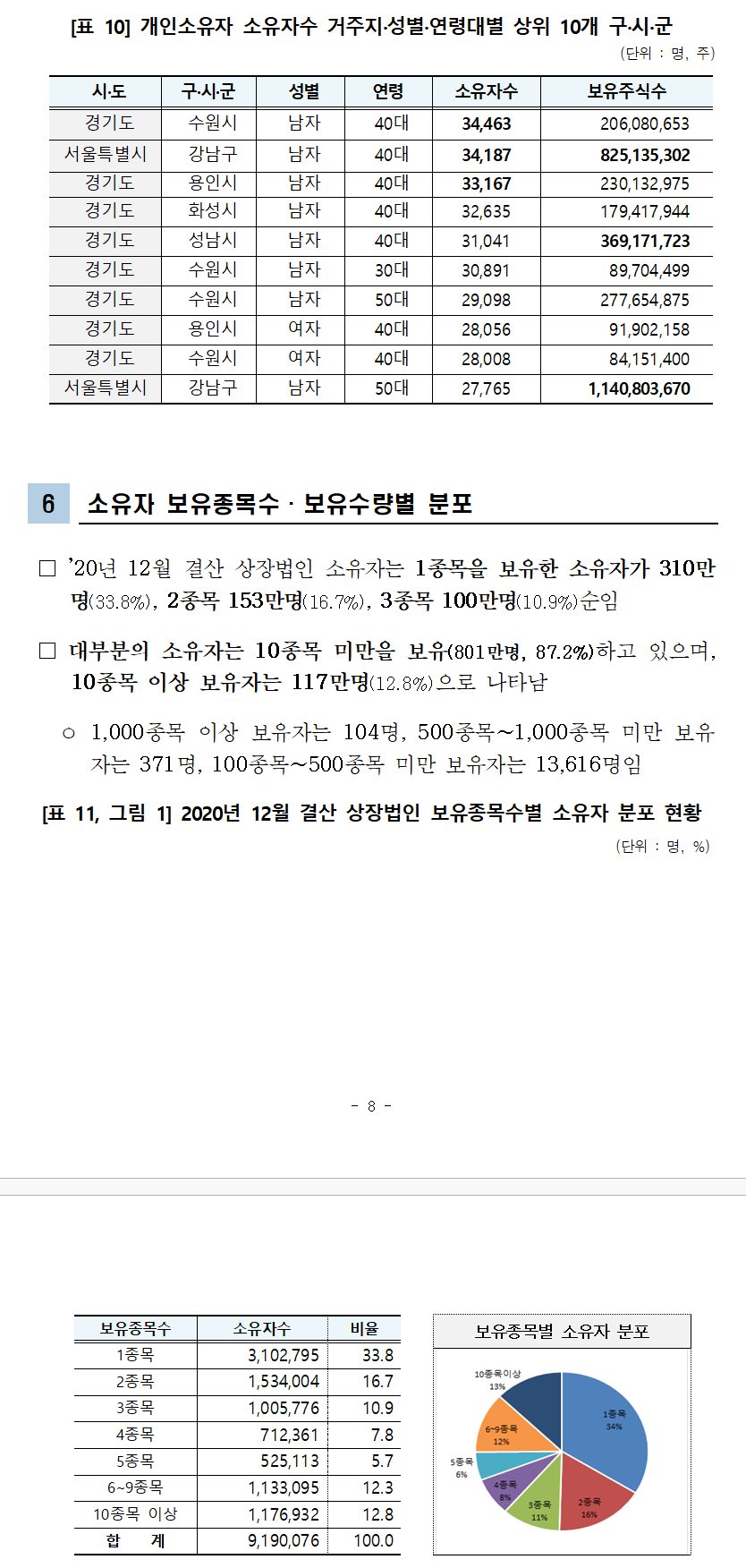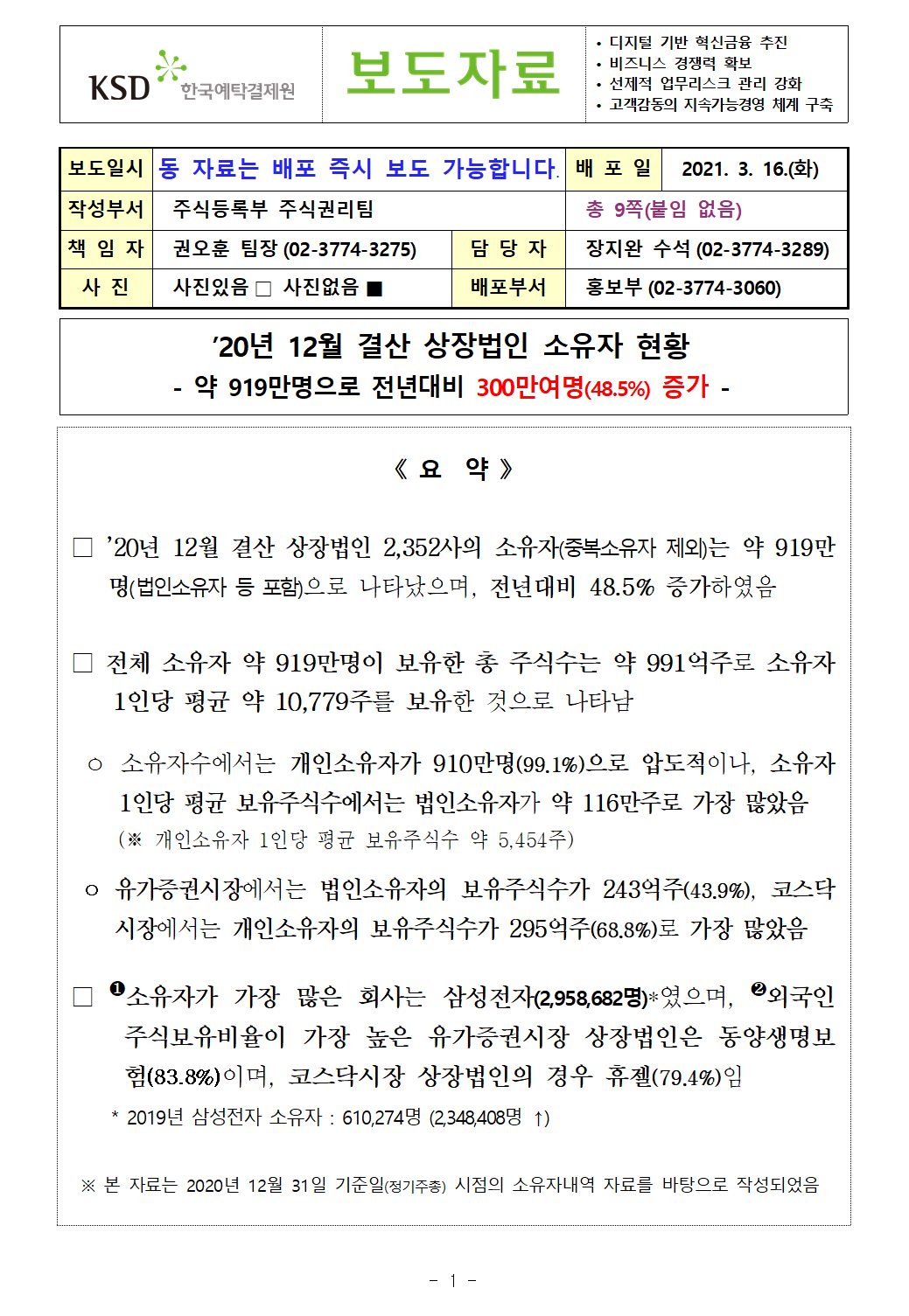 주식투자자, 수원 사는 40대男 최다…'부동의' 강남 제쳐 https://www.yna.co.kr/view/AKR20210317149200002 작년 주식소유자 300만명 급증…삼성전자 소유자 296만명(종합) https://www.yna.co.kr/view/AKR20210316062251002 오빤 삼성 스타일? :) 1인당 평균 보유종목수가 조금씩 늘기는 하는 것 같습니다. 관심있는 분은 보도자료 참고하세요. https://www.ksd.or.kr/ko/about-ksd/ksd-news/press-release/36060 HWP파일입니다. 1