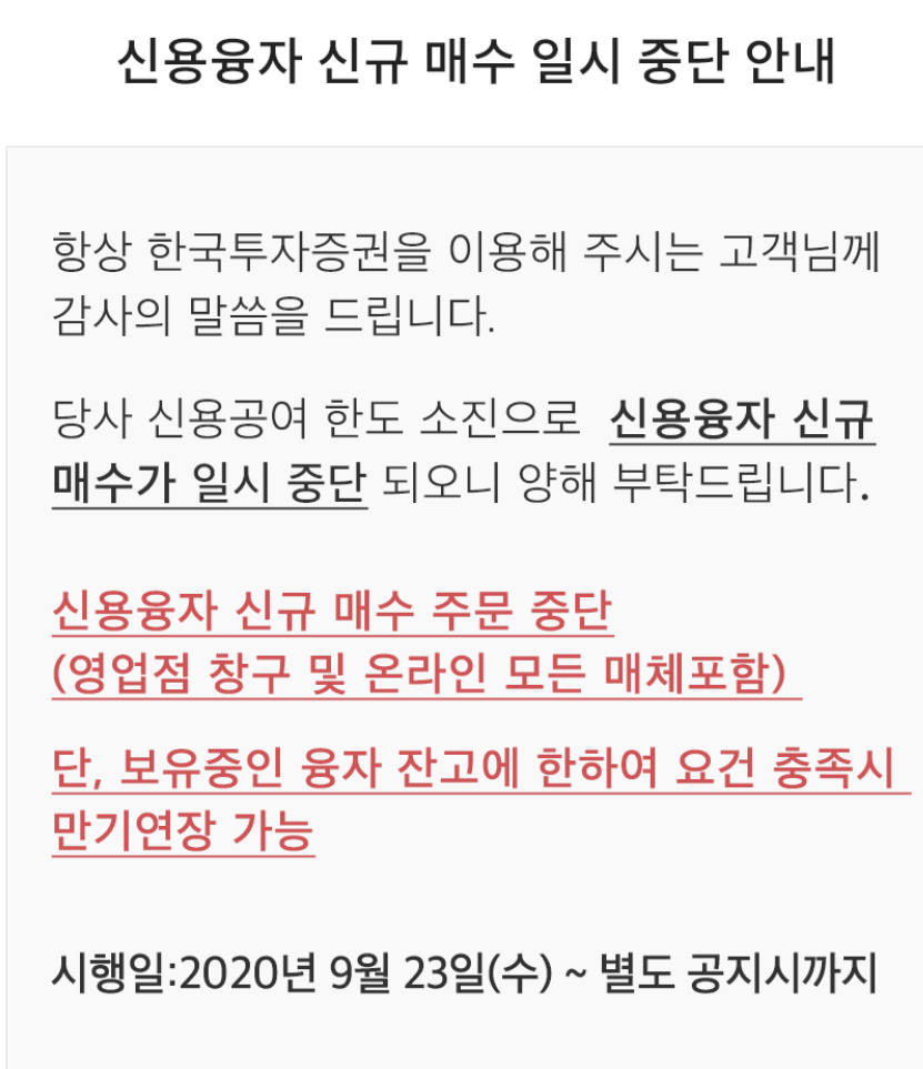 다들 잘 아시겠지만 신용융자 매수가 중단되었습니다