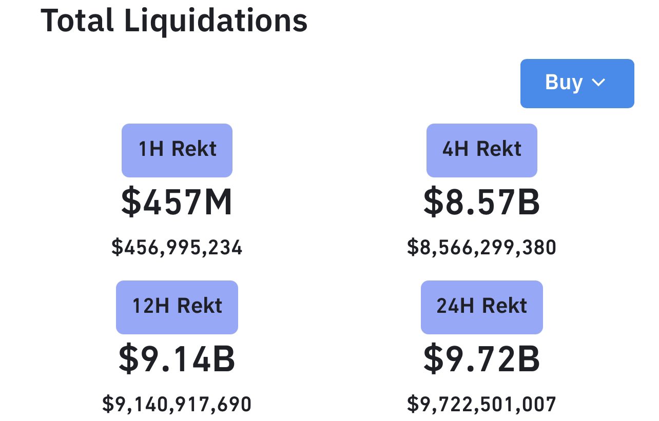 24시간 동안 97억 달러 규모의 크립토커런시 선물 거래 포지션이 청산됨.