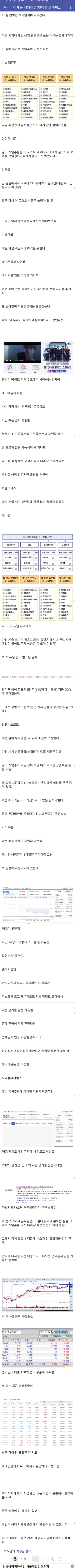 역시나 접근방법이 맘에 들어 가져와 봤습니다. 한줄요약 넷마블 : 게임주라기보다는 bts주. bts로 고점찍고 내려올듯. 펄어비스 : 시총 작아서 뉴딜etf 자금 들어올때 유리함. 연기금형님들 20층에 물려있음. 엔씨 : 말이 필요없는 대장주. 호갱님 돈뜯기의 달인. 미투젠 : 중국기업이라 하이리스크 하이리턴 더블유게임즈 : 자회사가 나스닥 추진하려다가 한번 실패해서 다른 게임주 달릴때 횡보하고 저평가받음. 횡보하는동안 연기금이 야금야금 150억 매수함. 최근에 지수 꼴아박는 와중에도 외궈들 수급 꾸준함. 5