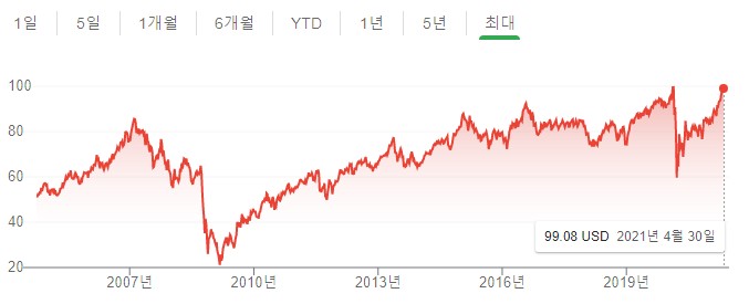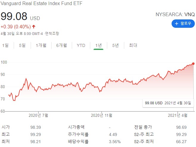 다음 소개할 ETF는 미국의 REITs에 투자하는 ETF입니다. 경기가 좋아지면 같이 살아나는 부동산 투자로 현재 미국 경기 성장이 예상되는 관계로 1년내 +30%정도를 이룬 ETF입니다.이외에도 전세계적인 경제위기를 제외하고는 늘 우상향해왔다는 점에서 더욱 믿음직 합니다. 0