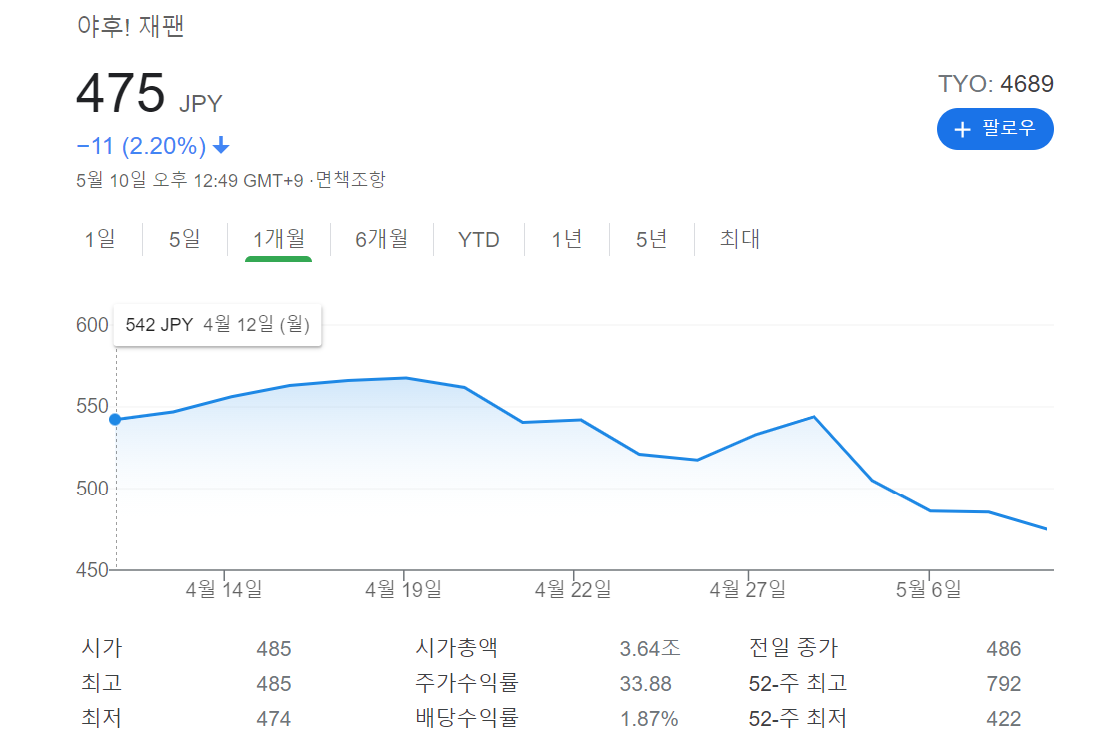 지난달 한국인이 매수하는 해외주식 순위권에 Z holdings가 포함된 적이 있습니다. 그 정도로 한국인에게는 관심인는 종목입니다만, 주가는 계속 꼬라박고 있읍니다. 물론 line의 보안 문제 때문에 주가가 내려간 것도 있지만, line의 data를 일본으로 옮기기로 한 것으로 해결될 것 같다는 생각도 듭니다. (덕분에 네이버는 가덕도 데이터 센터의 여유분을 판매하러 다니는 것 같기도..) 1