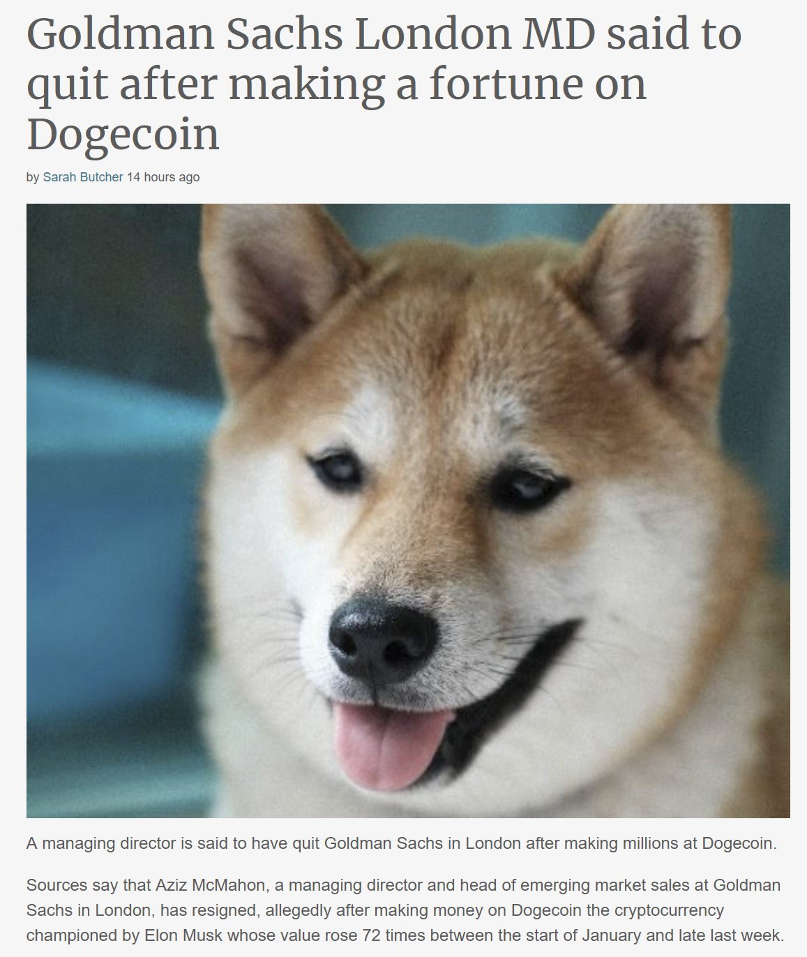 https://www.hankookilbo.com/News/Read/A2021042910380000485 1년 뒤에는 또 이야기가 바뀔지 모르겠지만, 소셜 미디어의 영향력이 정말 막강해진 것 같습니다. 각자도생이 살길?? https://www.efinancialcareers.com/news/2021/05/goldman-sachs-london-md-dogecoin 도지코인으로 큰돈 벌고 퇴사한 골드만 삭스 매니징 디렉터 얘기도 화제가 되었고,