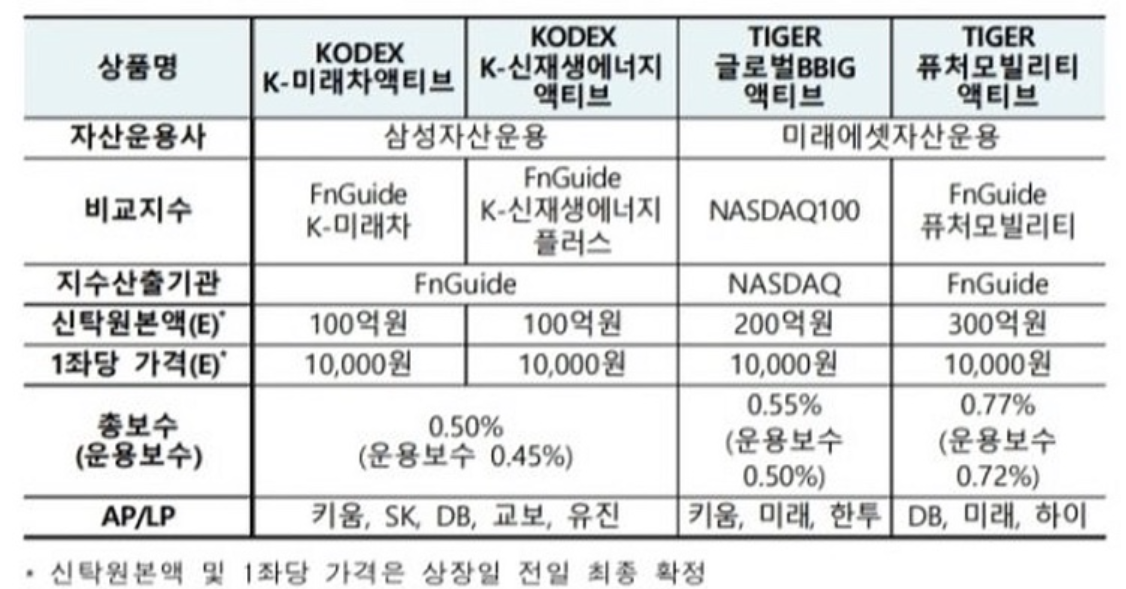미래에셋자산운용의 `글로벌BBIG액티브`·`퓨처모빌리티액티브`, 삼성자산운용의 `K-미래차`·`K-신재생에너지액티브`, 한국투자신탁운용의 `ESG액티비`·`친환경자동차 밸류체인액티브`, 타임폴리오자산운용의 `Kstock액티브`·`BBIG액티브 한국만 돈나무 ETF !!!! 근데 말이 액티브지 코스피 200 이랑 거의 다를게 없음 ;;; 구성종목들이 노잼 코스피 상위종목들이 대부분;; (미래에셋은 나서닥이 섞여있음) 1