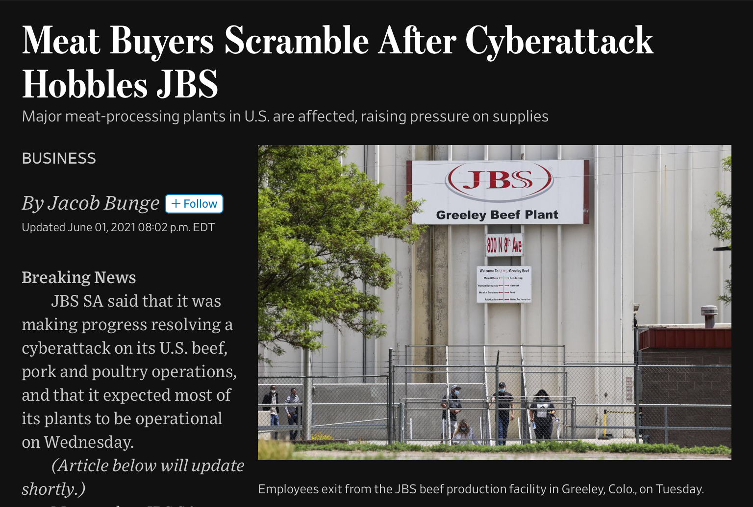 거의 미국 소고기 정육의 1/4을 처리하는 JBS 미국 내 정육시설들이 전부 셧다운이라고 합니다. 미국내에서는 돼지고기는 2위라고. 호주, 캐나다 정육 시설들뿐이 아니었군요. JBS는 20개국에 정육시설을 운영중입니다. JBS 측에 따르면 백업서버는 영향을 받지 않았고, 복구 중이라고 합니다. 만약 복구에 1주일이 넘게 소요되면 세계적으로 영향이 있을 것이라는 분석도 있습니다. All of JBS’s U.S. Beef Plants Were Forced Shut by Cyberattack Company’s other U.S. meatpacking facilities also disrupted Slaughter operations were also impacted in Australia, Canada https://www.bloomberg.com/news/articles/2021-05-31/meat-is-latest-cyber-victim-as-hackers-hit-top-supplier-jbs UFCW Will Protect JBS Workers to Ensure They Receive Their Proper Pay in Timely Fashion https://www.ufcw.org/press-releases/ufcw-will-protect-jbs-workers-to-ensure-they-receive-their-proper-pay-in-timely-fashion/ '송유관 해킹'에 美 발칵…사이버보안株 관심 커진다 https://new.redtea.kr/?b=39&n=4321 1