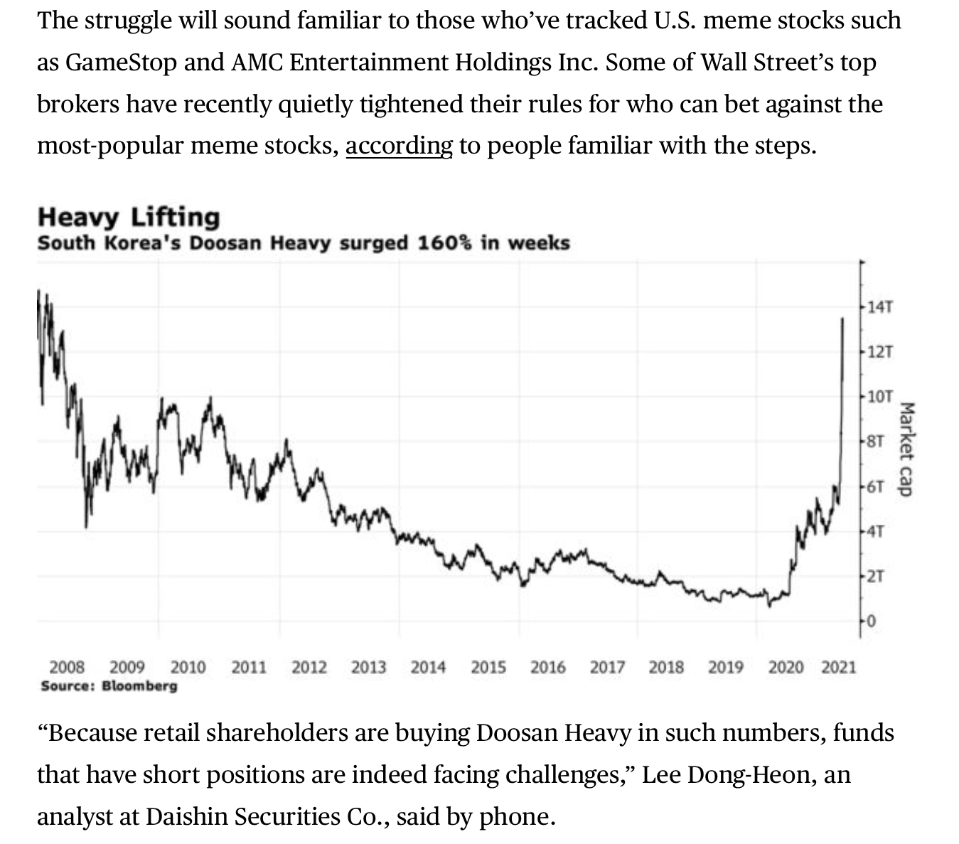 https://www.bloomberg.com/news/articles/2021-06-09/day-traders-in-duel-with-short-sellers-over-a-korea-meme-stock 한국판 밈 주식이라고. 두산중공업을 두슬라라고도 하는군요. 며칠 전 기사입니다만. '신풍은 가라'…작년 저점 대비 시총 증가율 1위는 HMM https://m.yna.co.kr/view/AKR20210605026000002 0