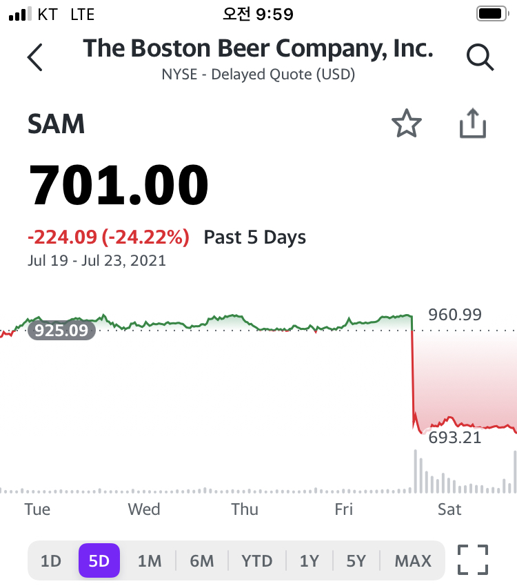 보스톤 비어 컴퍼니. 매출이 yoy 33.3%증가해서 600m인데 컨센보다 50m 못벌었다고 떡락. 1년전 주가보다 낮음. 1