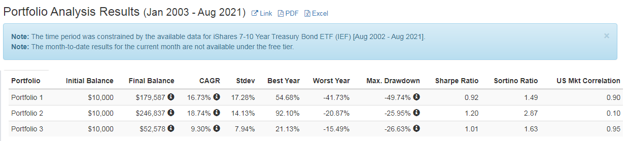 2003년은 닷컴버블의 여파도 꺼지고 나스닥 상승기 시작이라고 볼 수 있습니다. 그런데 2021년 8월까지 순수한 qqq를 qqq+vix가 큰 차이로 이기네요. 주식/채권 포트는 연복리가 반밖에 안됨.