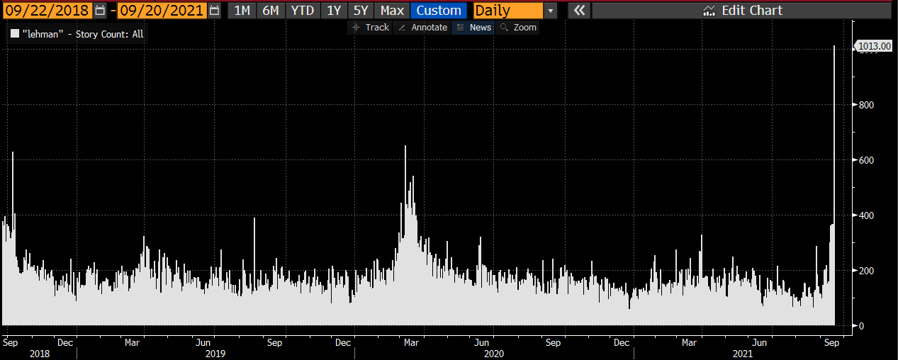2008년 9월 15일이 리먼이 갑작스레 파산 보호(Chapter 11) 신청을 한 날이기도 해서 관련 스토리 카운트가 확 올라간 것도 있겠습니다만, 헝다를 리먼과 비교하는 기사들이 최근 많이 나왔었습니다.