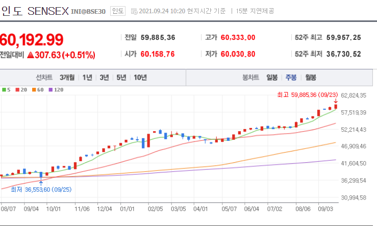 인도에서 4차 산업 혁명 발생? 작년 9월 3.6만이던 지수가 지금 6만?? 인도 연말연초에 코로나로 다 죽어나간다고 그랬던 것 같았는데.. 1