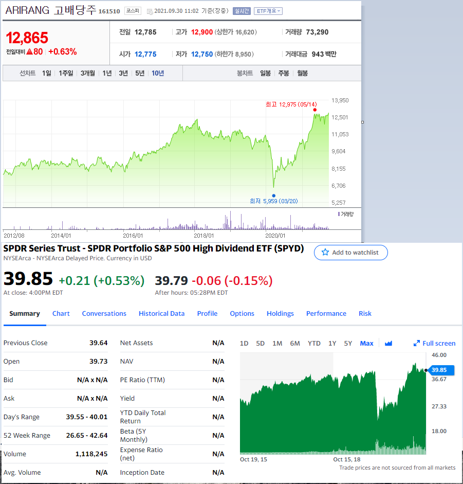 맥쿼리만큼 크는 건 없네요. 왜징? 고배당주는 시가배당율을 낮출만큼 주가도 올라야 하는 것 아닌감? SPYD는 최근 분배금이 20년 12월 0.6, 21년 3월 0.63 정도이면 1.23달러 분배했으니 40달러라치면 3%? 배당이 별로 안높아서 그런가? 국채금리 오르면 굳이 배당주를 살 필요는 없어지는 걸까요? 국내 아리랑고배당ETF말고 타이거 부동산인프라고배당 ETF는 맥쿼리와 리츠같은 놈들 위주로 포함되어있네요. 가격상승도 괜춘하고.. 어차피 안팔거라고 해도 자산가치가 높아져있는 것이 낮은 상태로 있는 것보단 훨 나으니까.. 요것도 고려해볼만한 듯.. 근데 리츠들은 상업용부동산이면 좀 별로일 듯도 한데... 공실이 안나니까 분배하는 거겠지 싶기도 하고..? 0