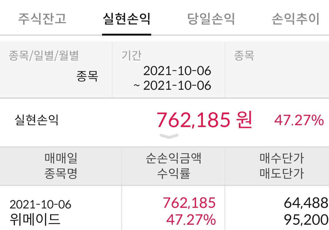 고통을 견디고 결실을 얻었습니다 처음에 몰빵했을때 시퍼런 마이너스 버텼어야...ㅜㅜ (그건 좀 심한 도박이었음ㅋㅋ) 쫄아서 팔았다 샀다 15주만 남겼더니 역시 감당할만한 작고 귀여운 수익을 얻었습니다 흑흑 믿는만큼 얻는건 맞습니다.ㅜㅜ 또 내려갈까봐 낼름 팔았더니 개미털고 올라가네요ㅡㅋㅋ 그래도 목표수익 40프로정도 넘었으니 미련없이 다른 먹이를 찾아가보겠습니다. 즐거웠다 위메이드...! 10