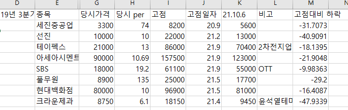 위에 종목들은 모 기관에서 19년 3분기에 샀던 것들. 내가 지난 1년 샀다팔았다 했던 종목들 보면 자신감이 없던 종목들은 대충 손익이 크지 않은 상태로 다시 매도했던 것 같다. 물론 믿던 종목들이 -60%까지 가서 손절한 것들도 있었지만.. 여하간 뭘하든 결국은 지수매매할 거 아니면 종목에 대한 공부가 필요한 것 같다. 그래서 다른 사람은 어떻게 했나 찾아본 내용이고.. 19년 3분기에 매입했다던 종목들을 왜 매입했나 결과가 어땠나 이런 거 찾아봤는데.. 가치평가라고 꼭 저per들을 산 것도 아니었네. 쟤네가 고점을 찍은 날짜들도 보면 19년 3분기에 사서 20년 3분기에 오른 게 하나. 나머지는 최소 1년반을 들고 있어야 2배는 먹는구만.. 근데 100%쯤 오르면 적절한 시점에서는 또 팔아야지 그냥 들고 있으면 확확 빠지네요. 내가 19년 3분기에 주식을 했다면 저런 종목들을 좋게 볼 수 있었을까..? 특히 SBS같은 거. 다들 OTT간다~ 하고 있을 때 살 수 있었을지 모르겠다. 0