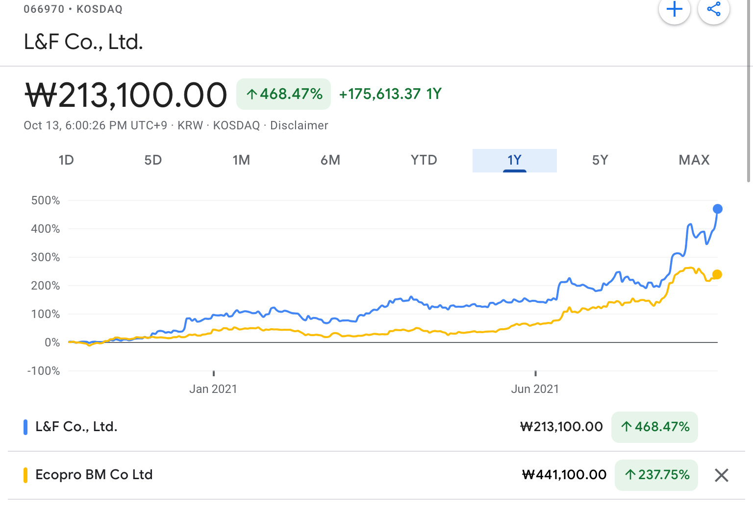 사실 3주째 가끔 보는데, 외국인 매수세가 꾸준하더니, 오늘은 좀 많이 올랐군요. 엘앤에프, 투자 유치·MSCI 편입 전망에 강세…최대주주 새로닉스도 상한가 https://www.mk.co.kr/news/economy/view/2021/10/970896/ 0
