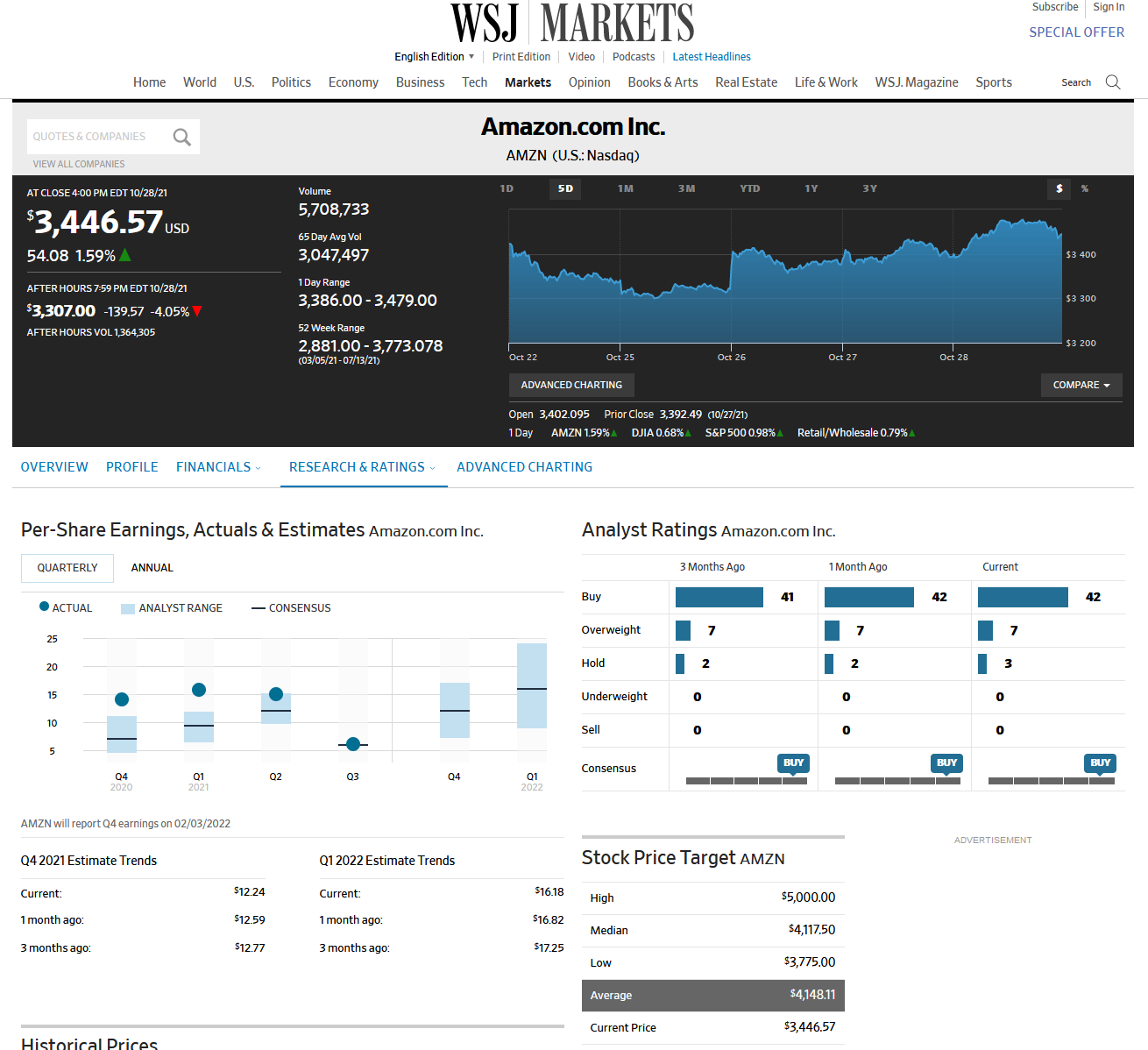 S&P500 투자만으로도 쏠쏠한 수익률을 보고 있었습니다만, 너무 재미가 없어서(..) 개별주를 투자할까 생각합니다. 미국 주식 애널리스트들의 컨센서스를 알 수 있는 싸이트들이 여럿 있네요. 그중 WSJ MARKETS라는 싸이트를 애용 중입니다. 전문가들이 BUY하라는 의견이 압도적이면 BUY, SELL하라면 SELL.. 물론 그들은 내 투자에 책임지지 않습니다만.. 0