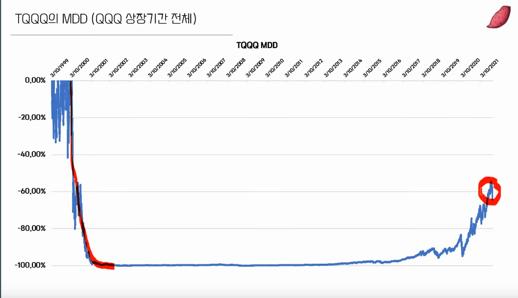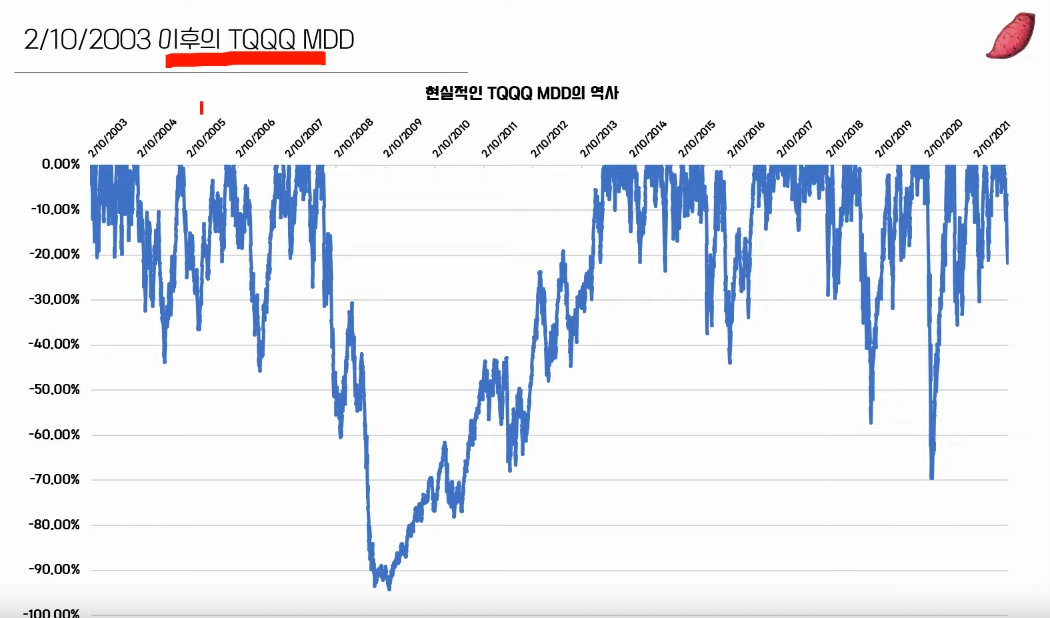 https://youtu.be/N9WPhJ7hLlU 어떤 유튜버가 QQQ 기반으로 상장 이전의 TQQQ를 추정해봤네요. (닷컴 버블 제외, 그 이후에 20년 동안) TQQQ MDD가 컸던 횟수 1. -20% : 19번 2. -30% : 10번 (특별히 별 이벤트가 없어도 TQQQ는 MDD -30%을 일상적으로 찍을 수 있다) 3. -40% : 6번 (리만, 코로나, 그 외 국제장세 불안정시기) 4. -50% : 3번 (리만, 코로나, 미중무역분쟁시기) 5. -60%, -70% : 2번 (리만, 코로나) 6. -80%, -90% : 1번 (리만) 0